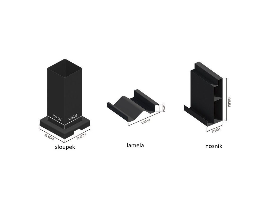 Robustní sloupek má rozměry 116x116 mm, při instalaci je zapotřebí počítat s patkou sloupku o rozměrech 160x160 mm. Patka je z 8 mm silné oceli a je navíc zakryta hliníkovým krytem (165x165 mm) s integrovaným drenážním systémem. Vyvýšený hliníkový profil ukrývá lamely tak, že z bočního pohledu nejsou viditelné a jsou v jedné linii s profilem.