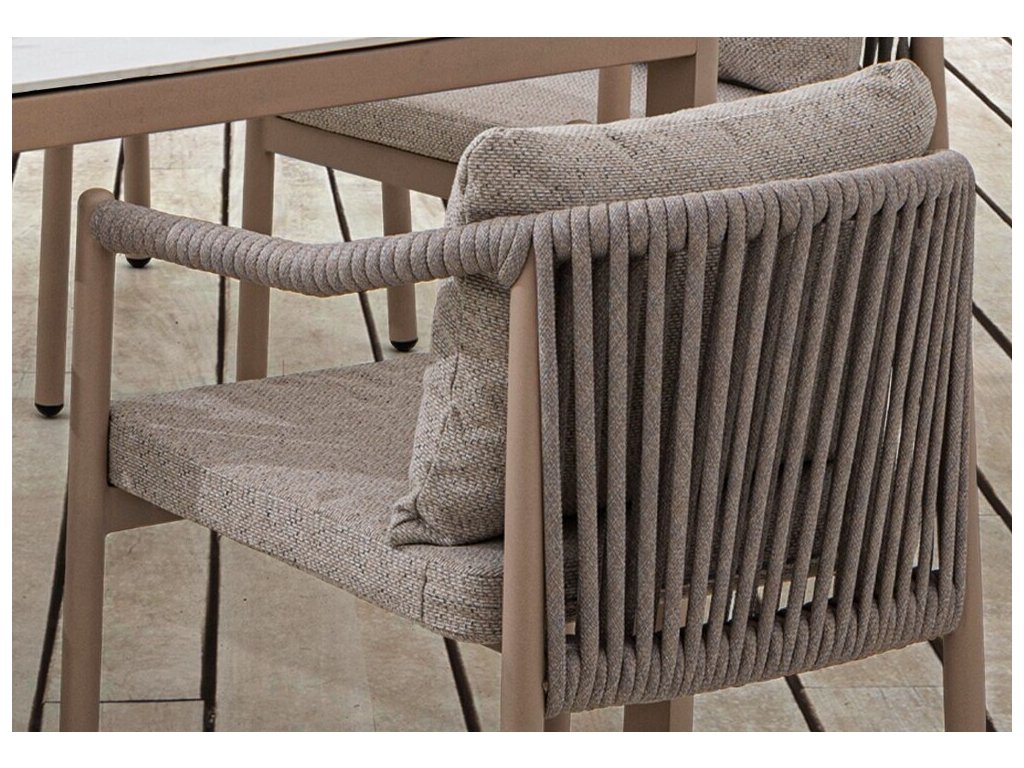 Luxusní hliníková souprava v cappuccino provedení, doplněna o velmi vkusný lankový, neboli provázkový výplet. Moderní souprava, která skvěle zapadne do každého exteriéru či interiéru.
