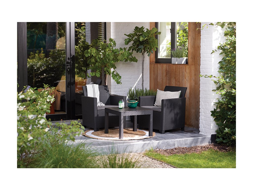 Proměňte svou terasu, balkon nebo dvorek soupravou Claire, která je vyrobena z lisovaného plastu v imitaci přírodního ratanu. Jedná se o lehký, ale zároveň pevný materiál. Souprava se skládá ze 2 křesílek a stolku. Vyznačuje se typickými hranatými liniemi a hladkými loketními opěrkami