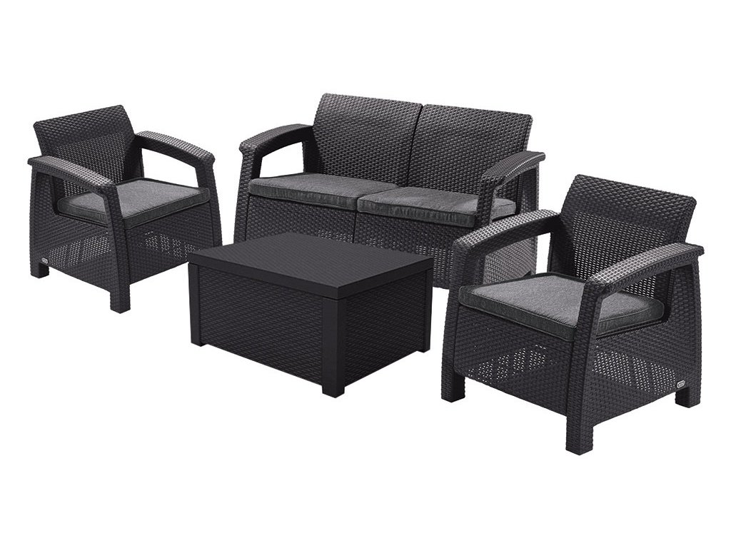 Jedná se o elegantní nábytek v imitaci přírodního ratanu, skládající se ze dvou křesel, dvojitého sofa a stolu, který zároveň slouží jako box!