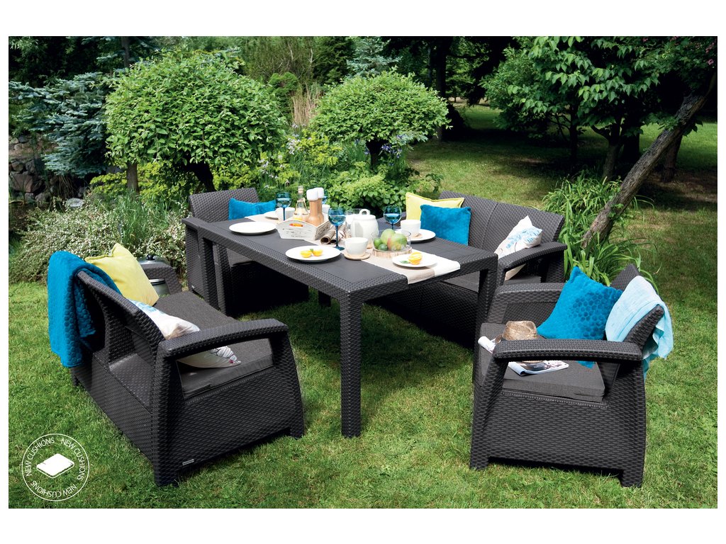 Corfu Fiesta je velký set nábytku v imitaci přírodního ratanu, skládající se ze dvou křesel, dvou dvojitých sofa a velkého obdélníkového stolu.