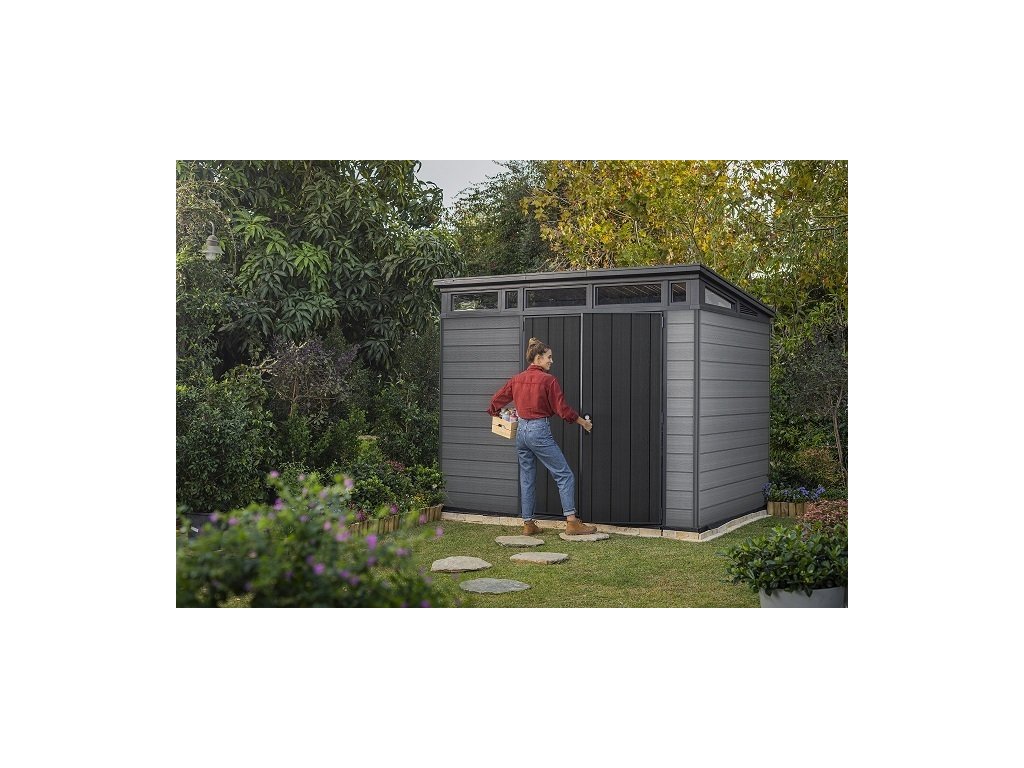 Je také vybaven pevnou designovou střechou, širokými dvojitými dveřmi a podlahou pro náročné použití s nosností 150kg na m2.