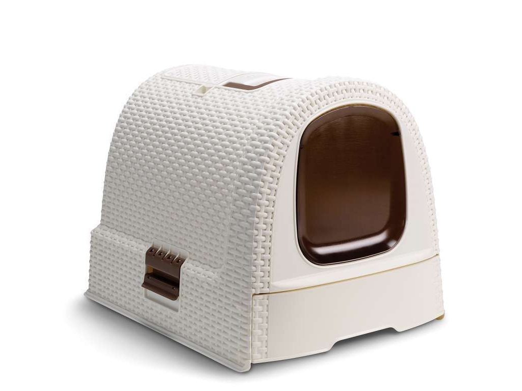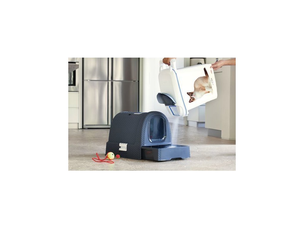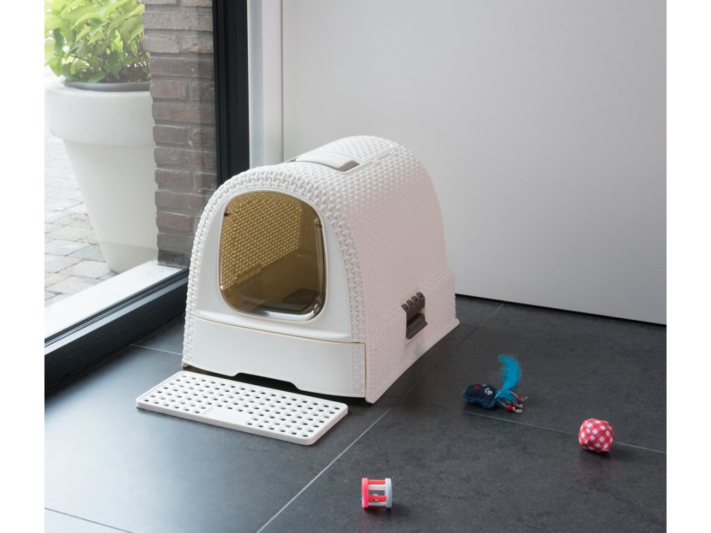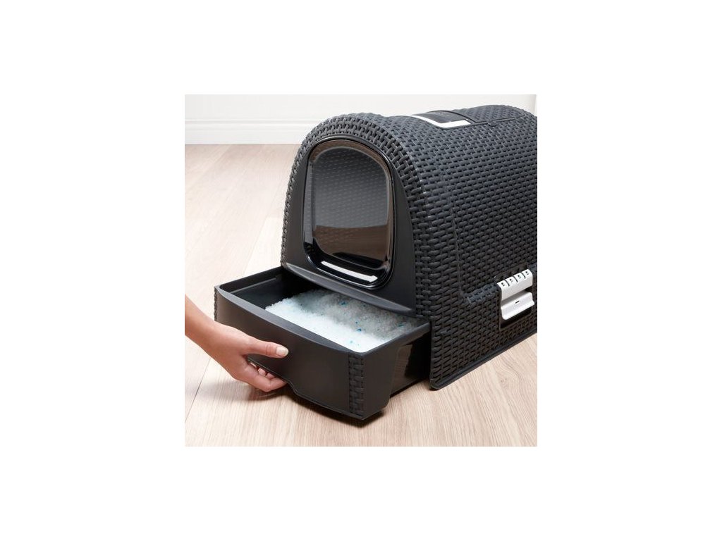 Toaleta je vybavena výsuvnou zásuvkou a skrýší na příslušenství (lopatka a rohož čistící tlapky jsou součástí balení).