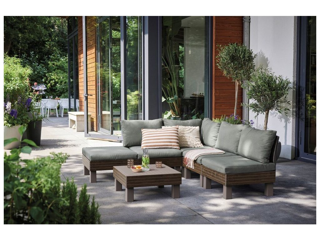 Pro ještě větší pohodlí jsou součástí soupravy 9 cm vysoké podušky a opěrky. Podušky jsou z příjemného materiálu polybavlna a spodní část je z netkané textílie s protiskluzovým tečkami. Pevný lisovaný plast, z kterého je souprava vyrobena, je odolný vůči nepříznivým povětrnostním podmínkám a UV záření.