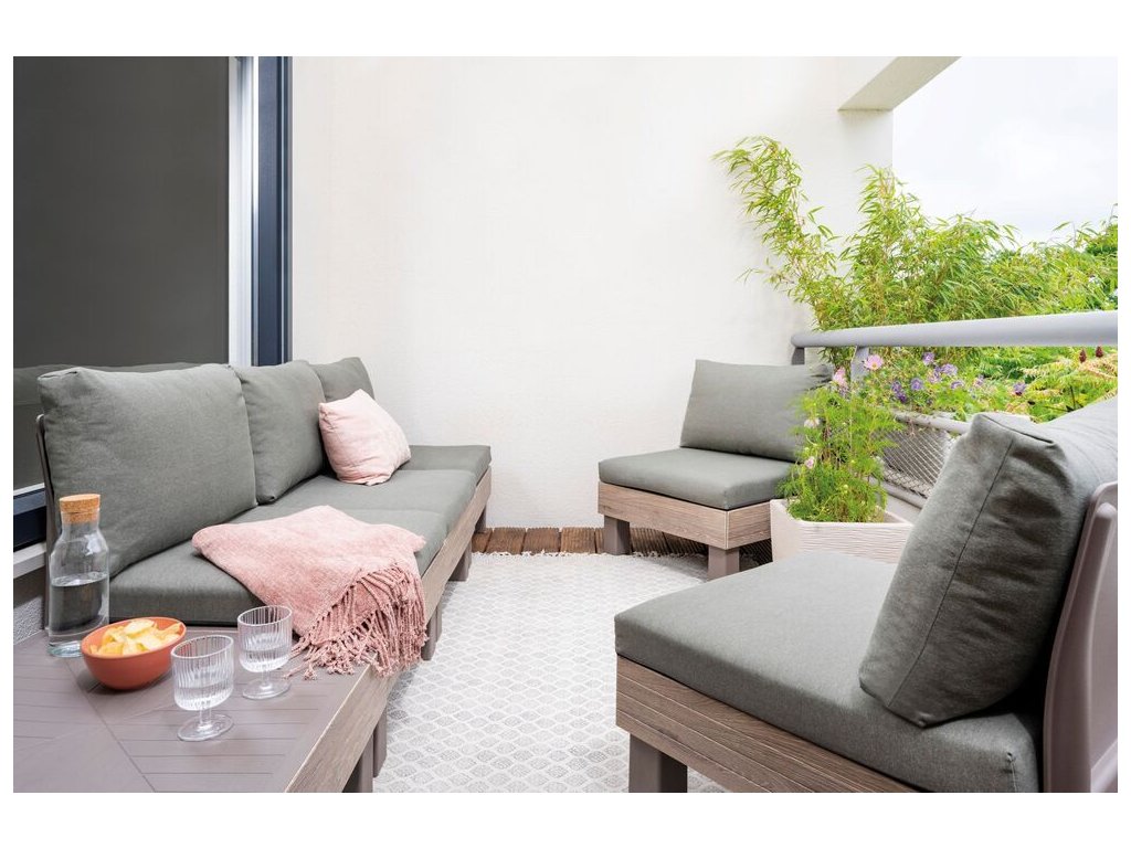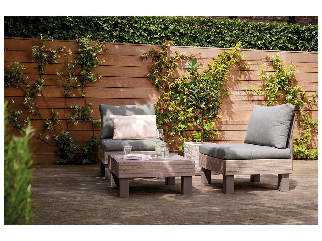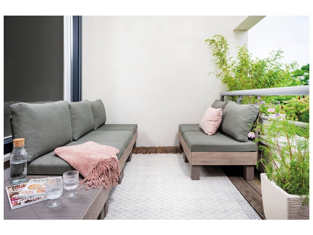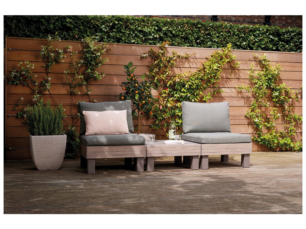 Pro ještě větší pohodlí jsou součástí soupravy 9 cm vysoké podušky a opěrky. Podušky jsou z příjemného materiálu polybavlna a spodní část je z netkané textílie s protiskluzovým tečkami. Pevný lisovaný plast, z kterého je souprava vyrobena, je odolný vůči nepříznivým povětrnostním podmínkám a UV záření.