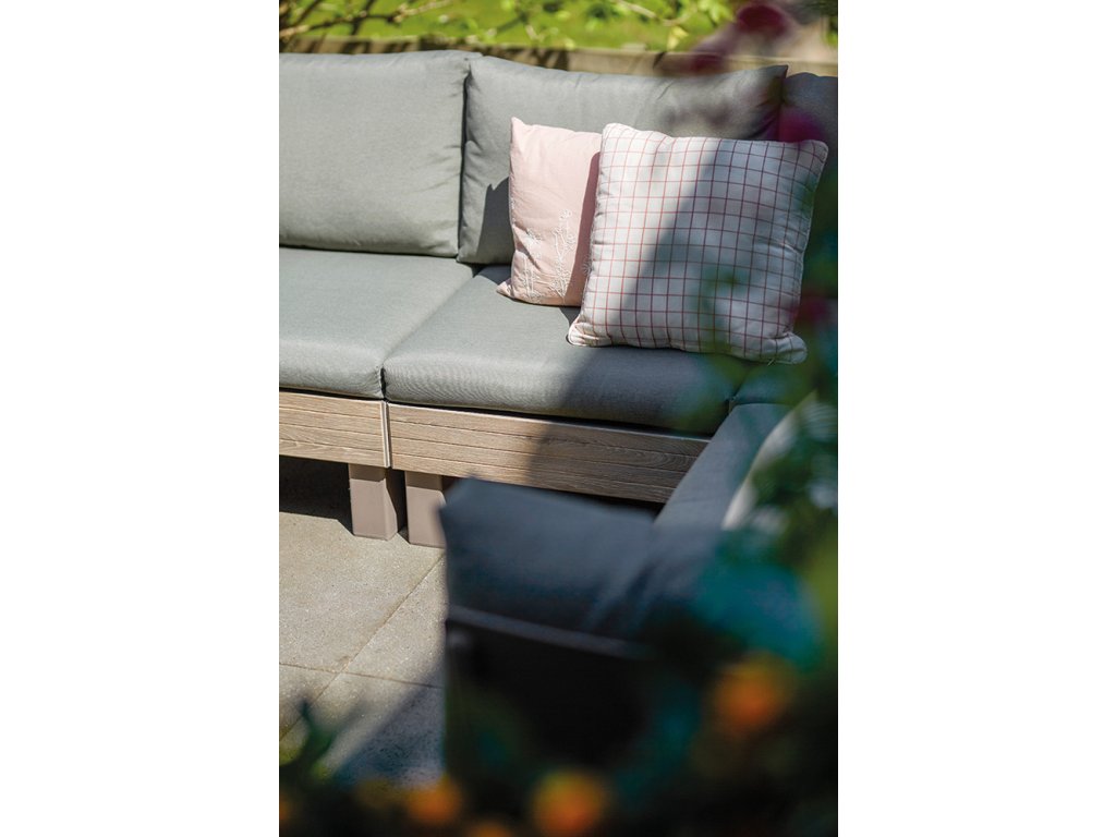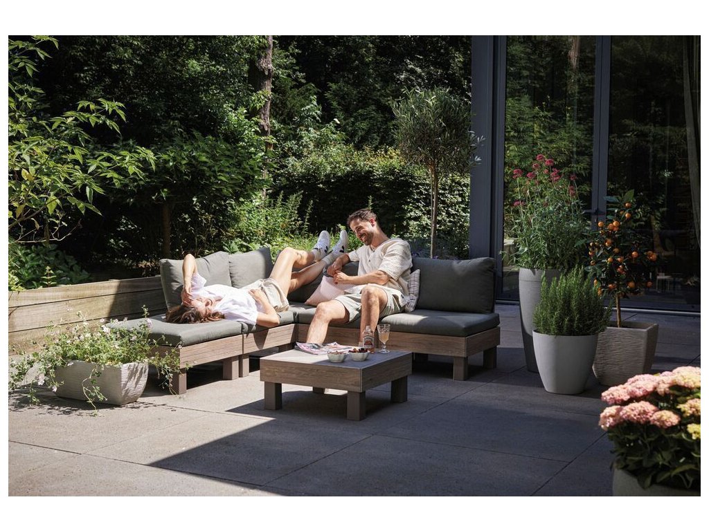 Pro ještě větší pohodlí jsou součástí soupravy 9 cm vysoké podušky a opěrky. Podušky jsou z příjemného materiálu polybavlna a spodní část je z netkané textílie s protiskluzovým tečkami. Pevný lisovaný plast, z kterého je souprava vyrobena, je odolný vůči nepříznivým povětrnostním podmínkám a UV záření.