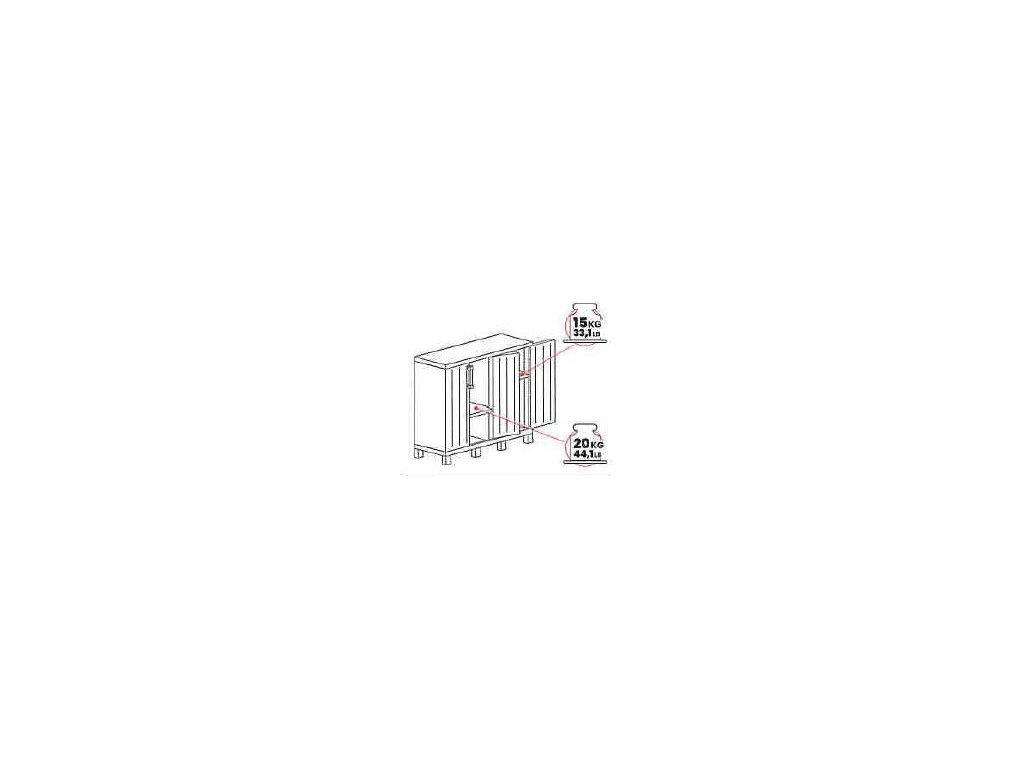Skříňka je vybavena dvěma nastavitelnými policemi, jedna (v širší části skříňky) unese až 20 kg a druhá (v užší části skříňky) 15 kg nářadí a pracovních pomůcek, dává Vám možnost flexibilně uspořádat vnitřní prostor podle Vašich individuálních potřeb.
