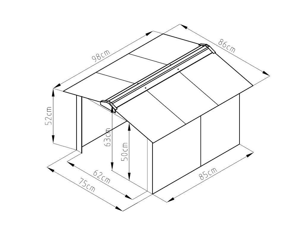 sklon střešního křídla 14° (sedlová stříška) , rozměry předního otvoru 62x50 cm, rozměry zadního dílu 20x50 cm