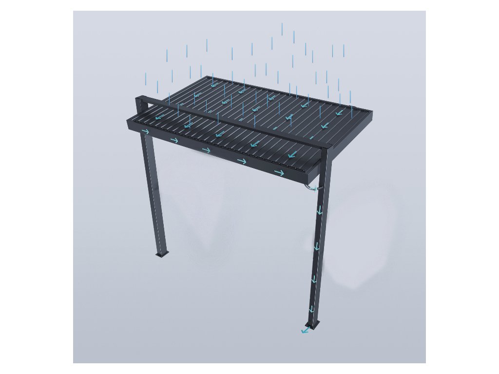 Správným nastavením lamel ochrání přístřešek proti slunečním paprskům, zároveň umožňuje snadnou ventilaci prostoru a naopak dokonalý přístřešek v případě deště.