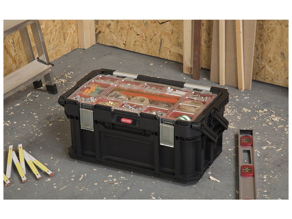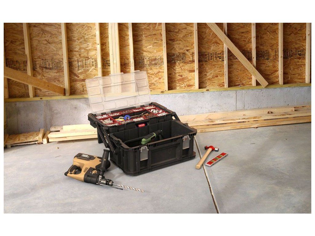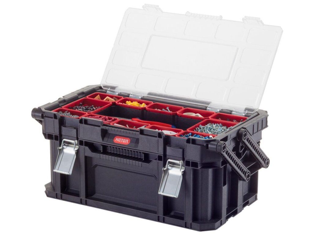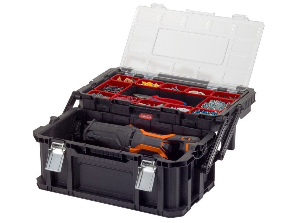 Box je vyroben z odolného plastu a organizéry uvnitř boxu usnadňují orientaci v obsahu. Pevná konstrukce zvládne bezpečné přenášení i plné zatížení a pohodlná kovová rukojeť usnadňuje manipulaci. Box obsahuje kovové západky, které drží víko pevně uzavřené. Nosnost boxu je až 20 kg.