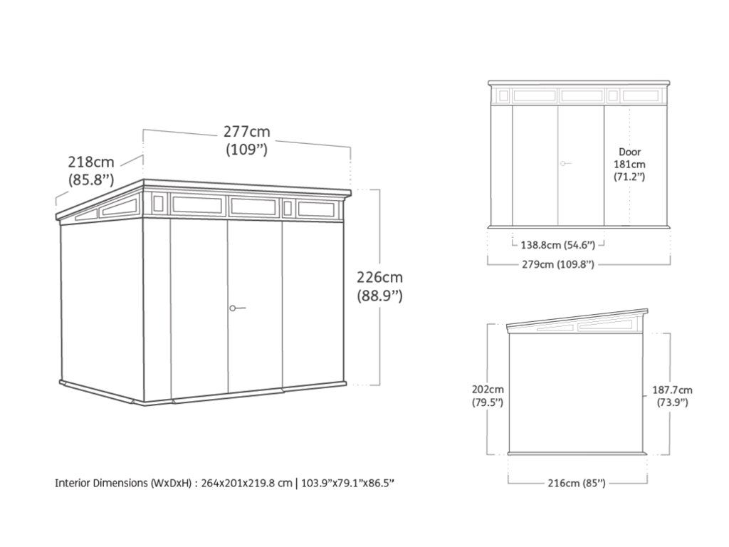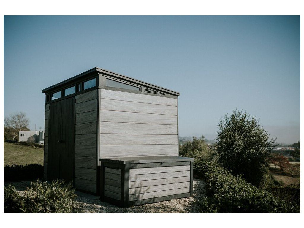 Bezúdržbový domek PENT 9x7 je vyroben z jedinečného materiálu DECOCOAT, který je inspirován moderním vzhledem v imitaci dřeva. Domek má robustní konstrukci s dvojitými stěnami a kovové výztuhy.
