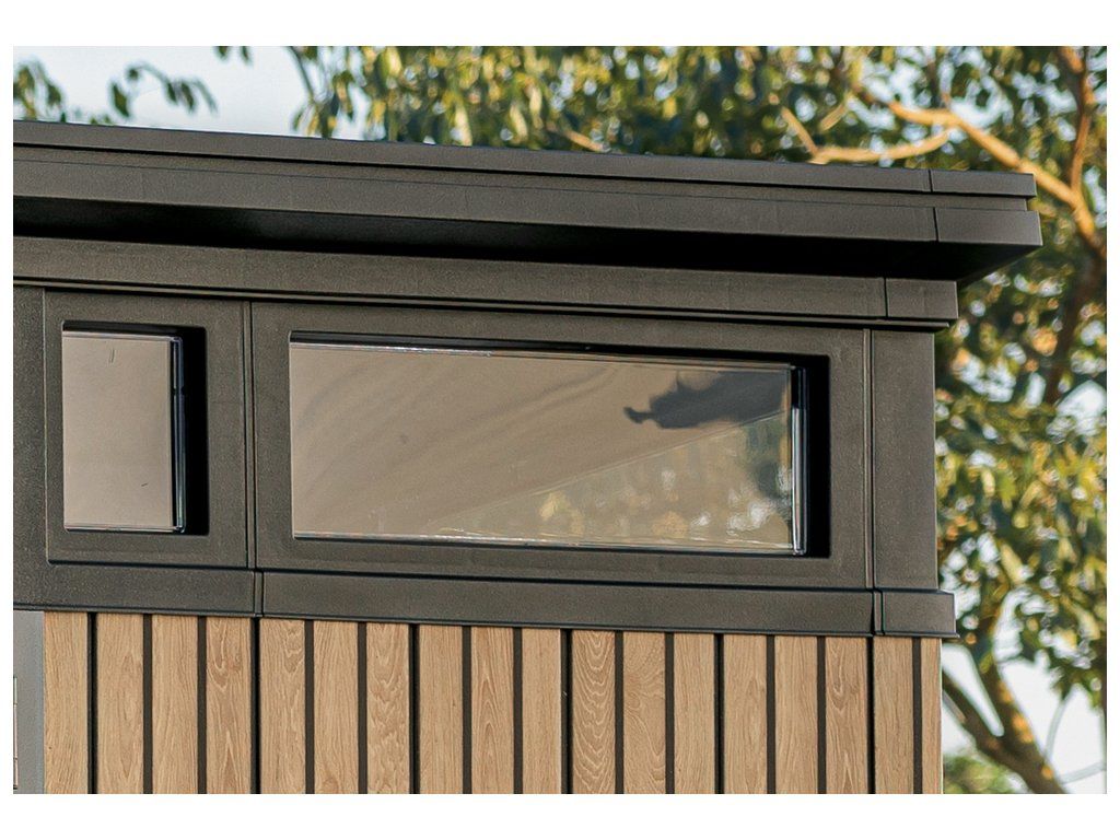 Bezúdržbový domek PENT 9x7 je vyroben z jedinečného materiálu DECOCOAT, který je inspirován moderním vzhledem v imitaci dřeva. Domek má robustní konstrukci s dvojitými stěnami a kovové výztuhy.