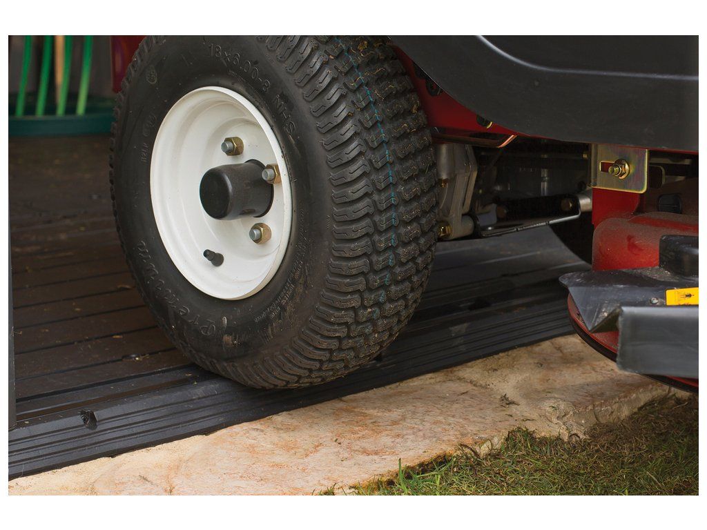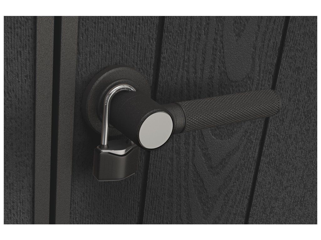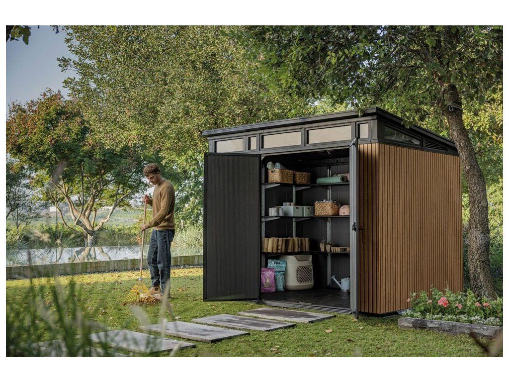 Je také vybaven pevnou designovou střechou, širokými dvojitými dveřmi a podlahou pro náročné použití s nosností 150kg na m2.