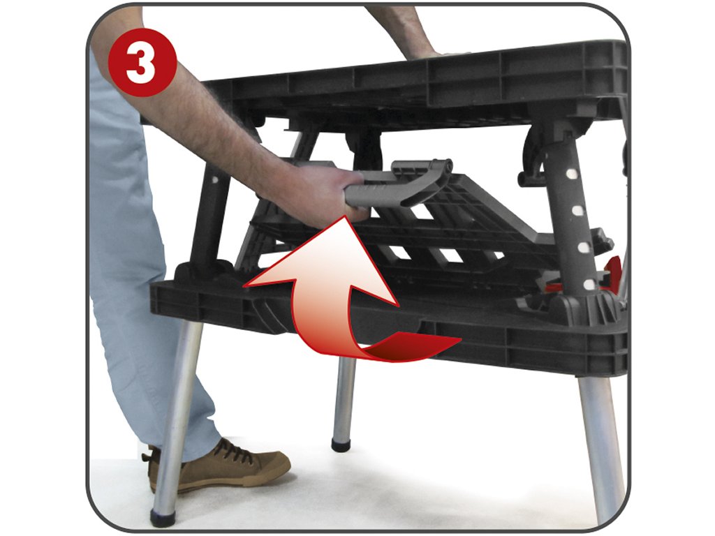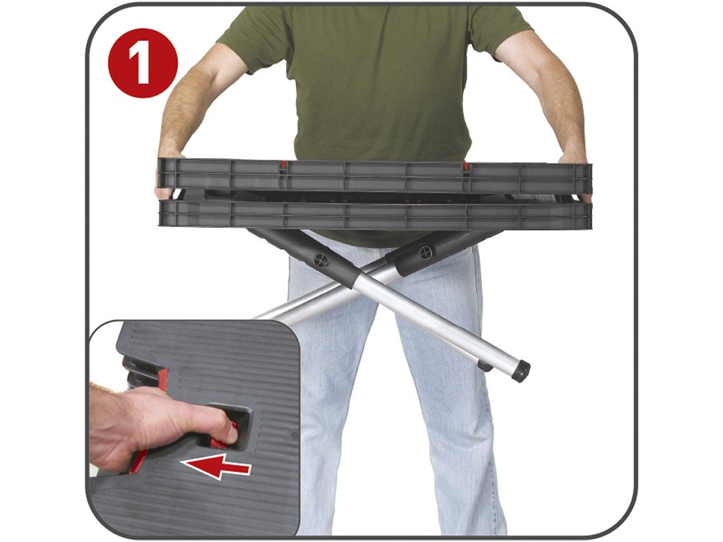 Přenosný pracovní stůl s integrovanou rukojetí.