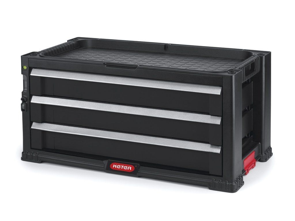 - masivní úložný box z pevného a odolného plastu se třemi shodně velkými zásuvkami