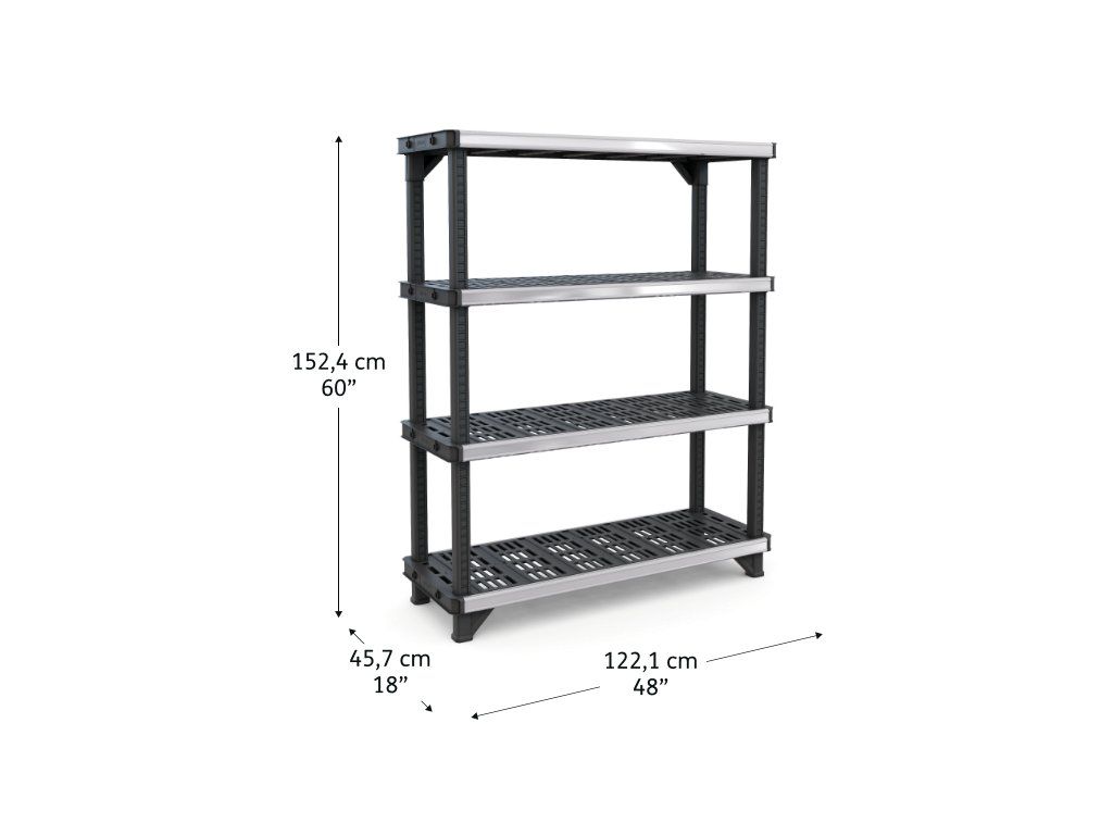 Profesionální a odolný regál FUSED představuje ideální řešení pro dílny, garáže, sklady i technické místnosti. Spojuje výhody pevného plastu s kovovými výztuhami, díky čemuž nabízí výjimečnou stabilitu a celkovou nosnost až 720 kg (180 kg na jednu polici).