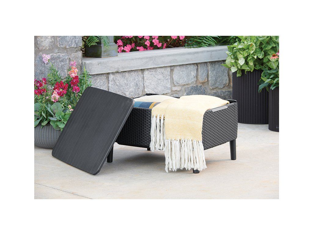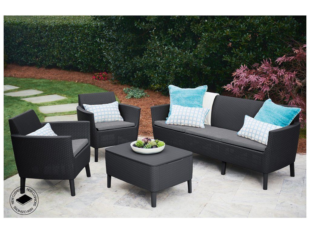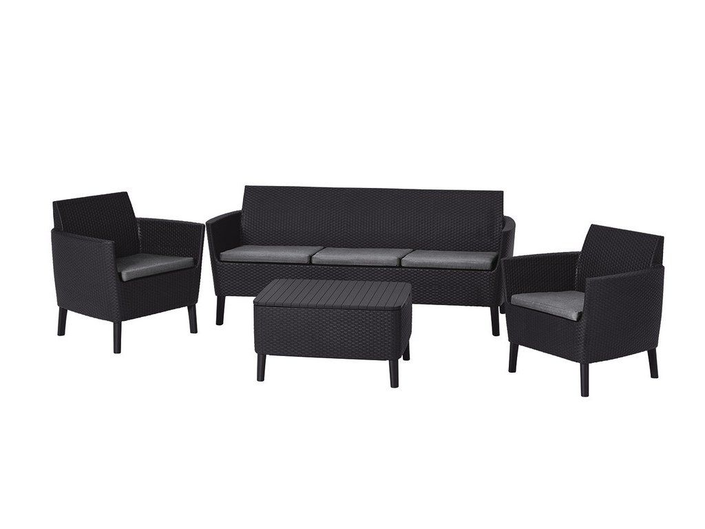 Jedná se o elegantní set v imitaci ratanu, skládající se ze dvou křesel, trojitého gauče a stolu, který navíc slouží jako úložný box.