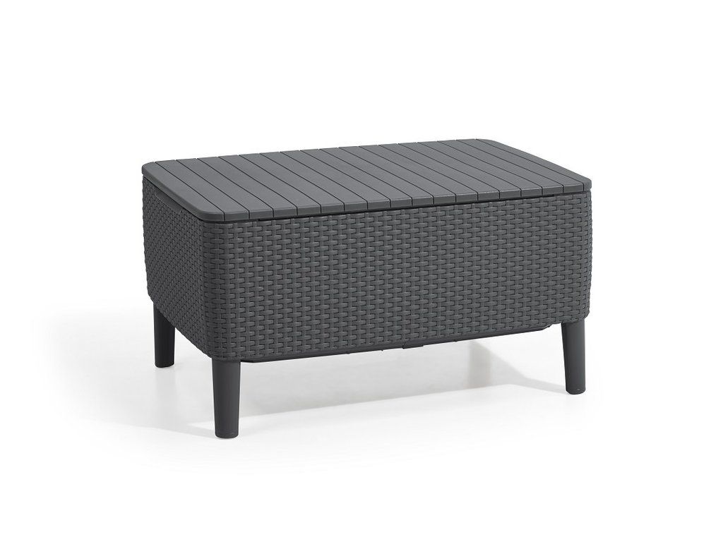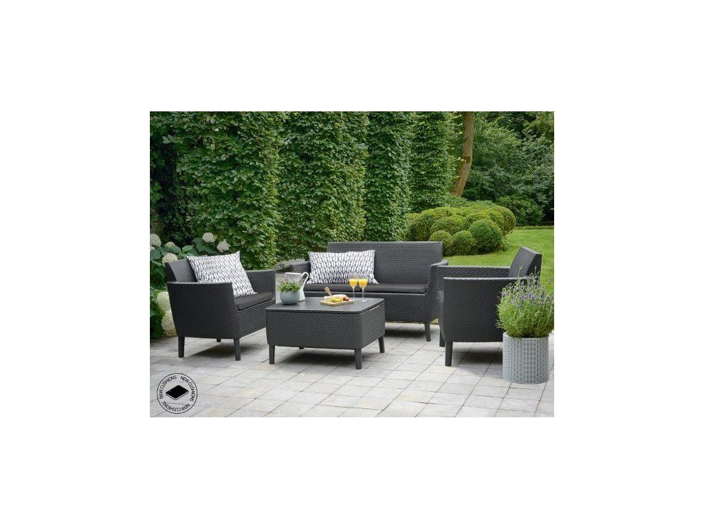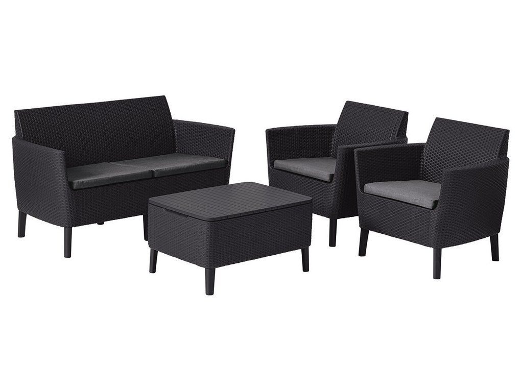 Jedná se o elegantní set v imitaci ratanu, skládající se ze dvou křesel, dvojitého gauče a stolu, který navíc slouží jako úložný box.