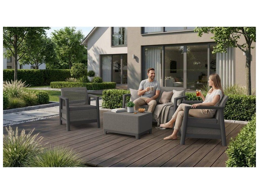 Velkou výhodou je rychlá montáž bez použití nářadí, díky které je sada připravena k použití během několika minut. Součástí setu jsou dvě pohodlná křesla, dvojmístné sofa a praktický stolek s úložným prostorem, ideální pro uložení drobností, polštářků nebo zahradních doplňků.