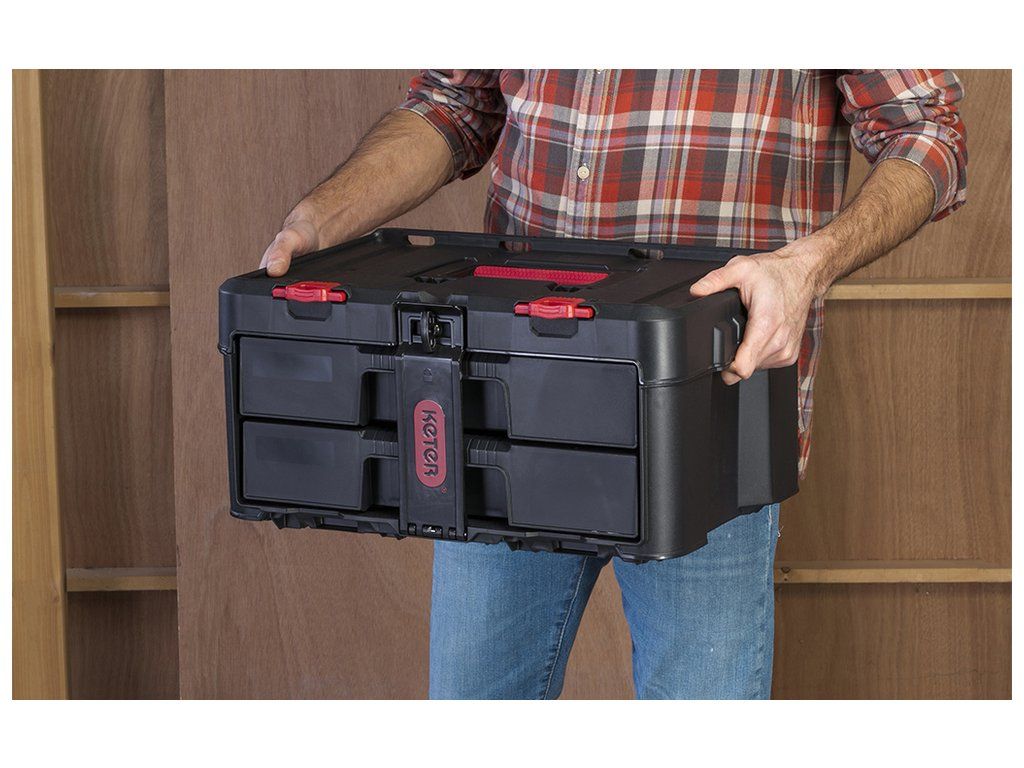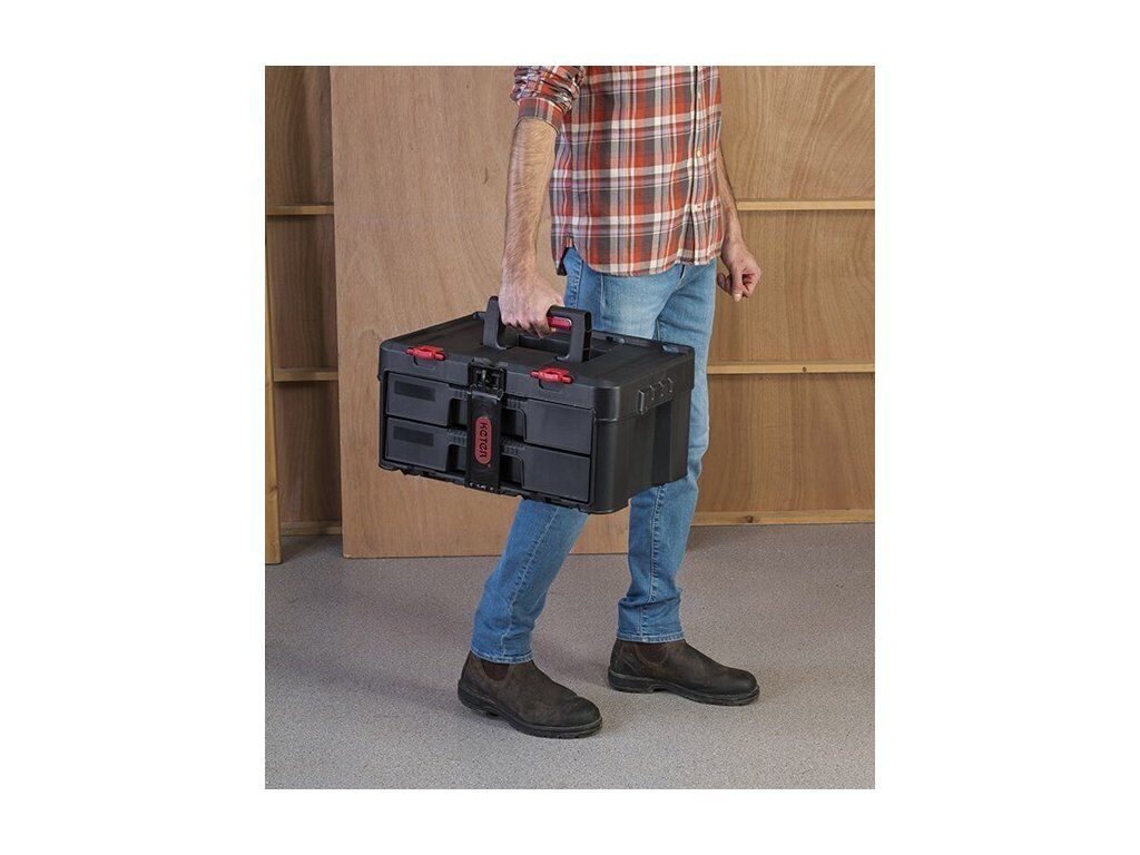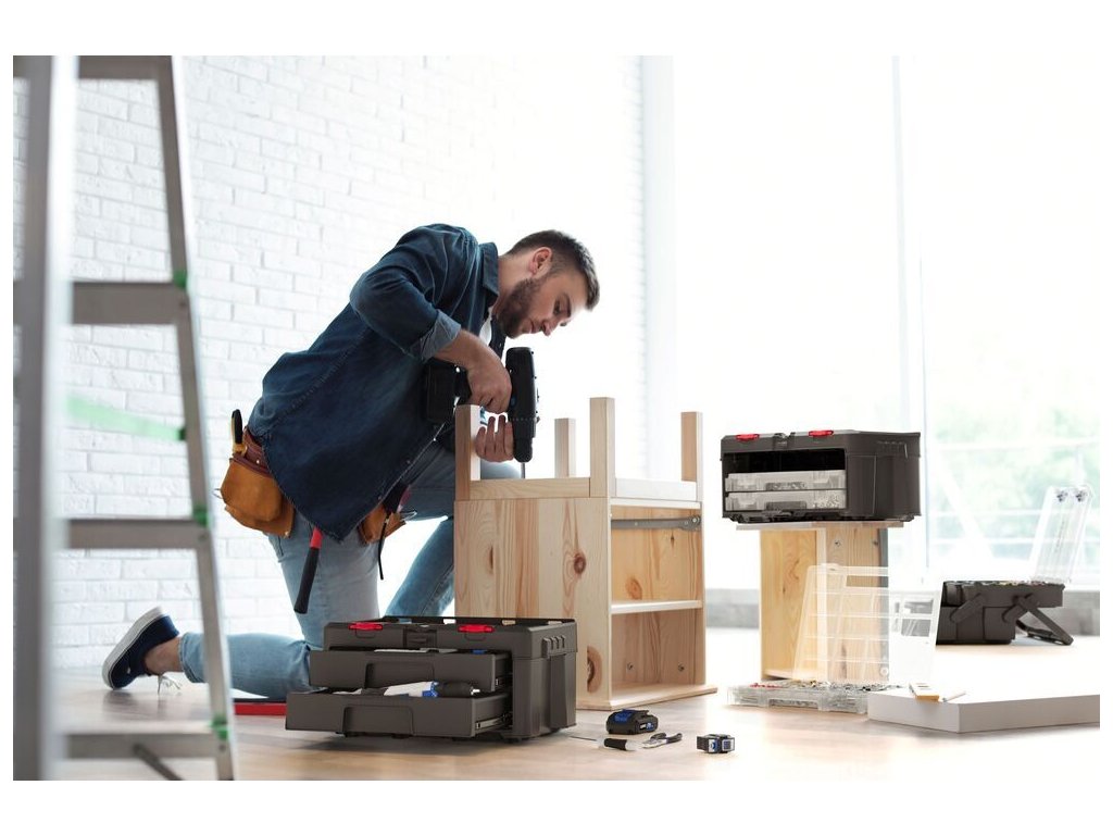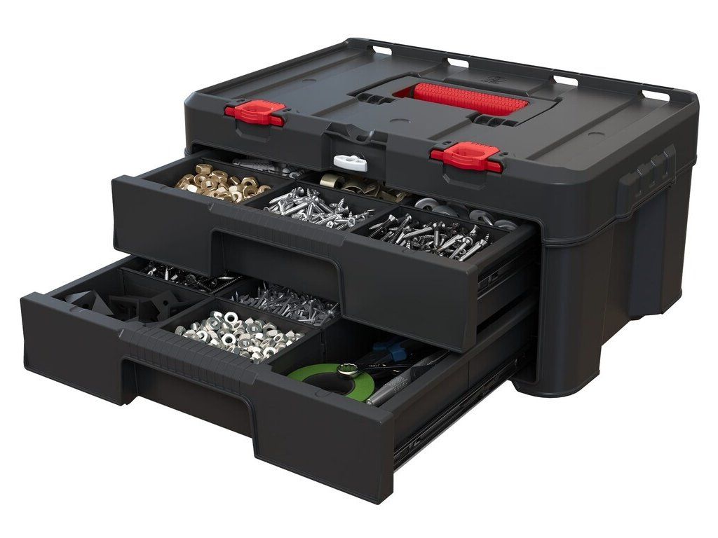 Box je vybaven 2 zásuvkami, které lze celé vytáhnout, abyste se pohodlně dostali i k věcem vzadu. Uvnitř boxu jsou vyjímatelné přepážky, takže si prostor uspořádáte dle vlastních potřeb. Udrží pohromadě ruční nářadí, drobný materiál i příslušenství k nářadí.