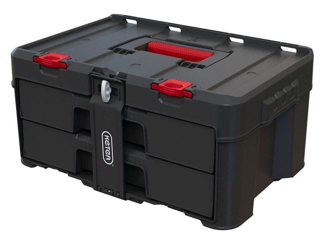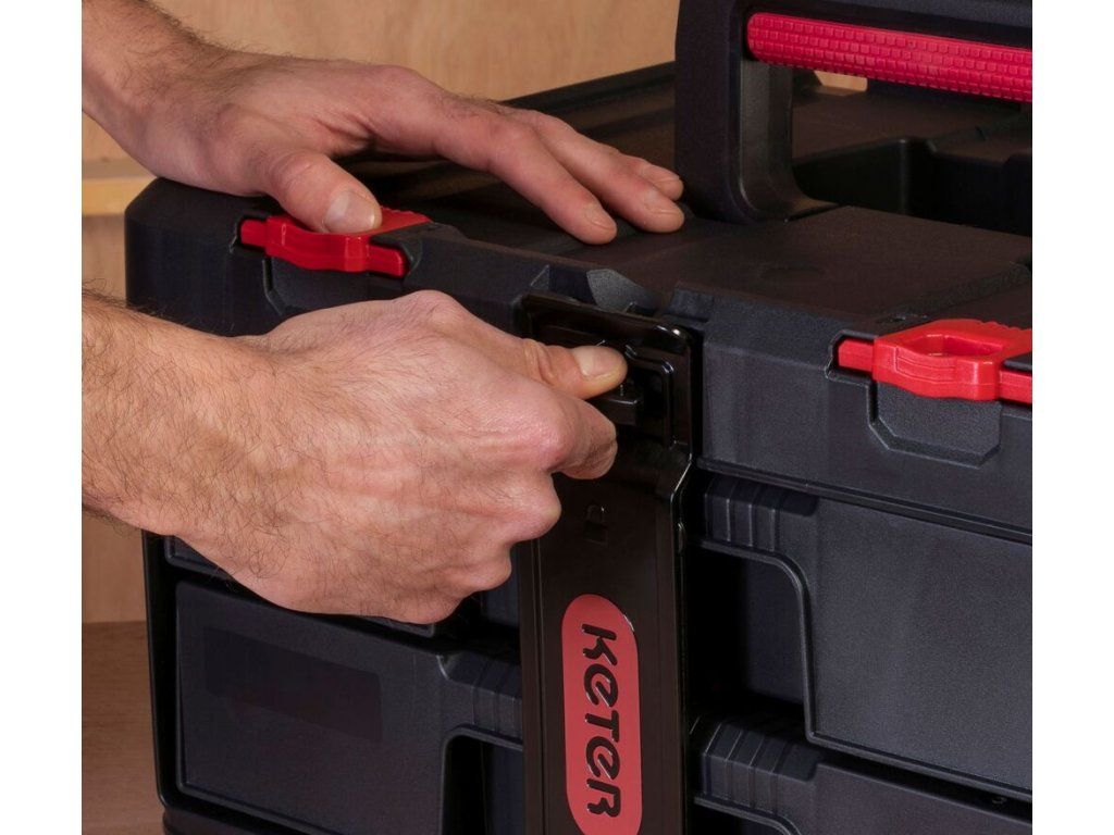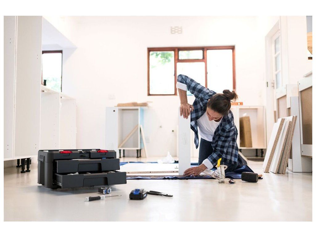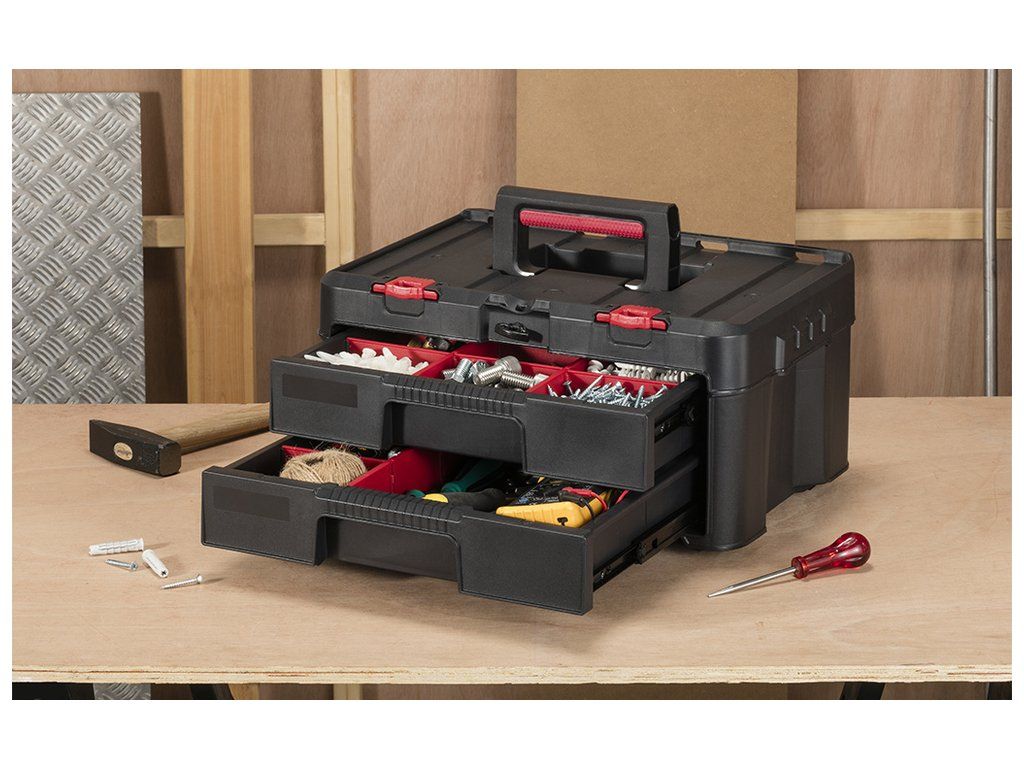Box je vybaven 2 zásuvkami, které lze celé vytáhnout, abyste se pohodlně dostali i k věcem vzadu. Uvnitř boxu jsou vyjímatelné přepážky, takže si prostor uspořádáte dle vlastních potřeb. Udrží pohromadě ruční nářadí, drobný materiál i příslušenství k nářadí.