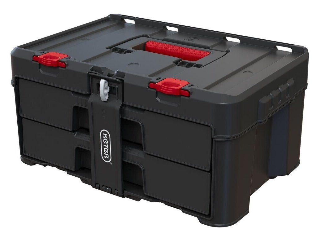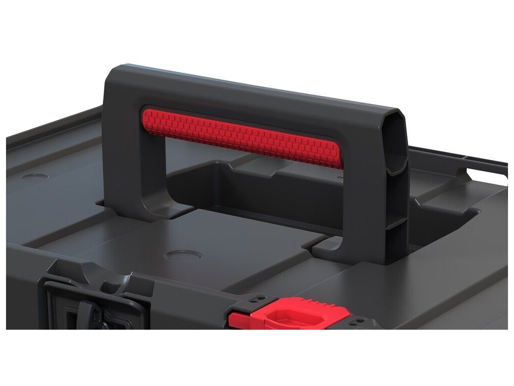 Polykarbonátová uzamykací lišta drží box pevně zavřený, aby se obsah nevysypal ani při častém převážení. K pohodlné manipulaci slouží ergonomické madlo a boční úchyty. Nosnost boxu je až 10 kg.