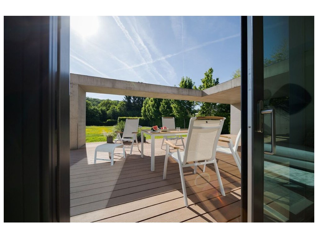 - Teakové prvky s certifikací FSC® na područkách a opěradle – přirozený vzhled a pohodlná opora