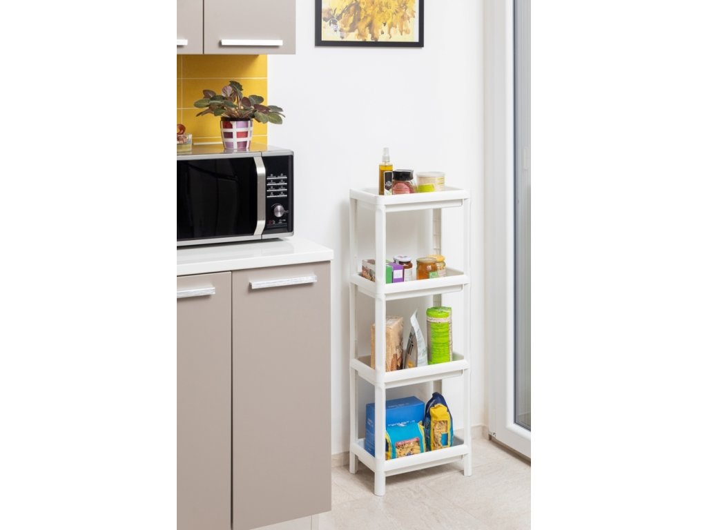 Multifunkční čtyřpatrový regál LINDA představuje praktický a stylový způsob pro efektivní využití menších prostorů a pro snadnou organizaci ve Vašem domě. Nabízí dodatečný prostor pro uložení potravin, kuchyňských pomůcek či jiných drobností například v koupelně.