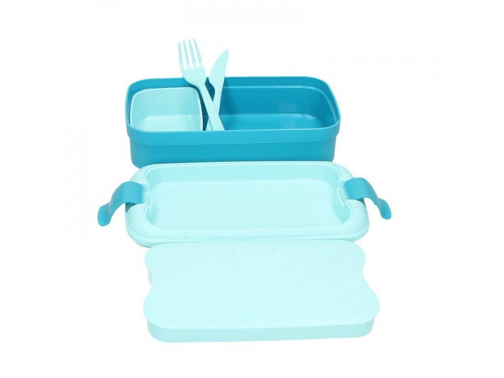 Cestovní svačinový box s vidličkou a nožem.