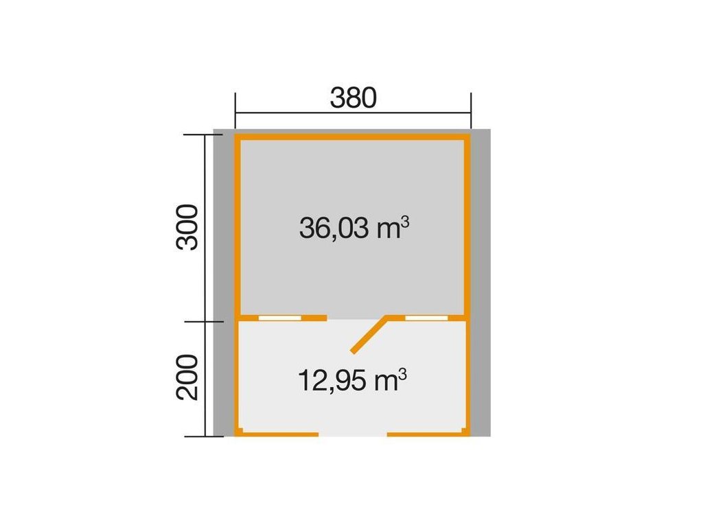 Základna domku je 380 x 500 cm, síle stěny 45 mm, podlaha z masivního dřeva o tloušťce 19 mm a masivní dřevěné střeše o tloušťce 19 mm.