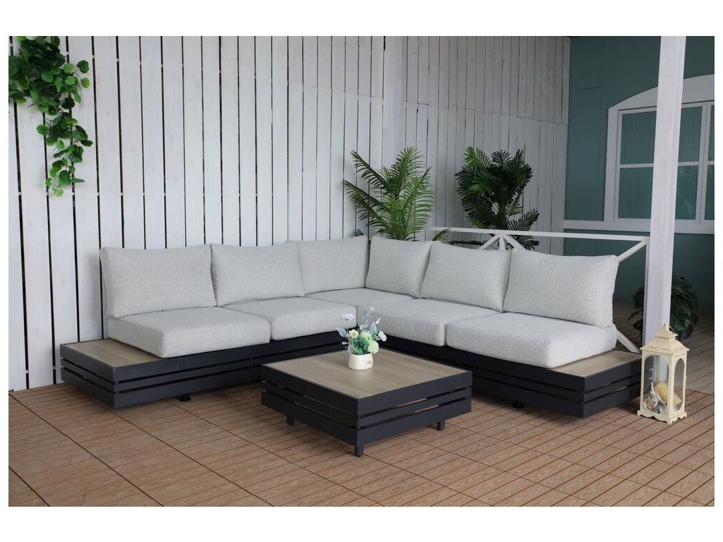 Luxusní hliníková souprava v grafitovém provedení, doplněna o stolovou desku z hliníku a pryskyřice v dezénu dřeva. Moderní souprava, která skvěle zapadne do každého exteriéru či interiéru.