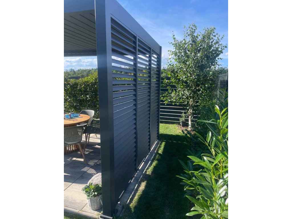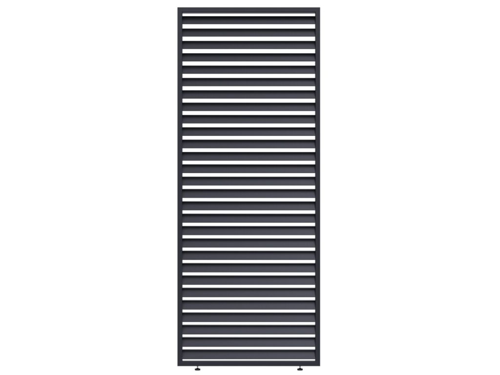 Pro maximální využití bioklimatických pergol nabízíme také příslušenství v podobě panelu s horizontálními fixními lamelami pro zastínění bioklimatické pergoly a získání většího soukromí.