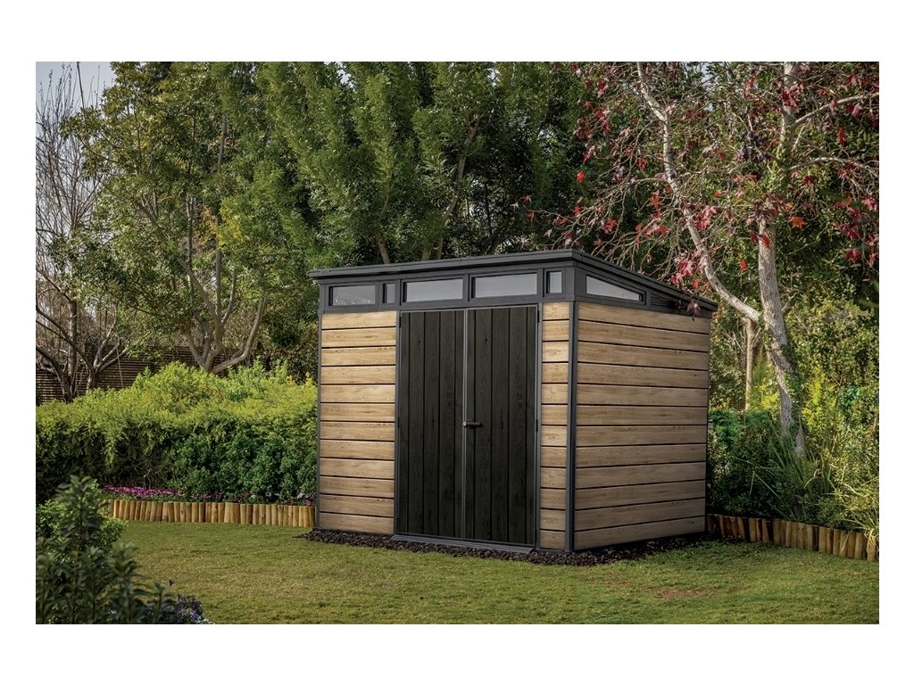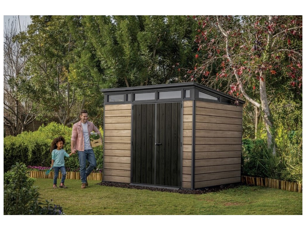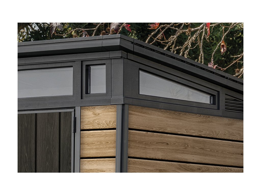 Bezúdržbový domek PENT 9x7 je vyroben z jedinečného materiálu DECOCOAT, který je inspirován moderním vzhledem v imitaci dřeva v barevném odstínu ASHWOOD - jasanové dřevo. Domek má robustní konstrukci s dvojitými stěnami a kovové výztuhy.