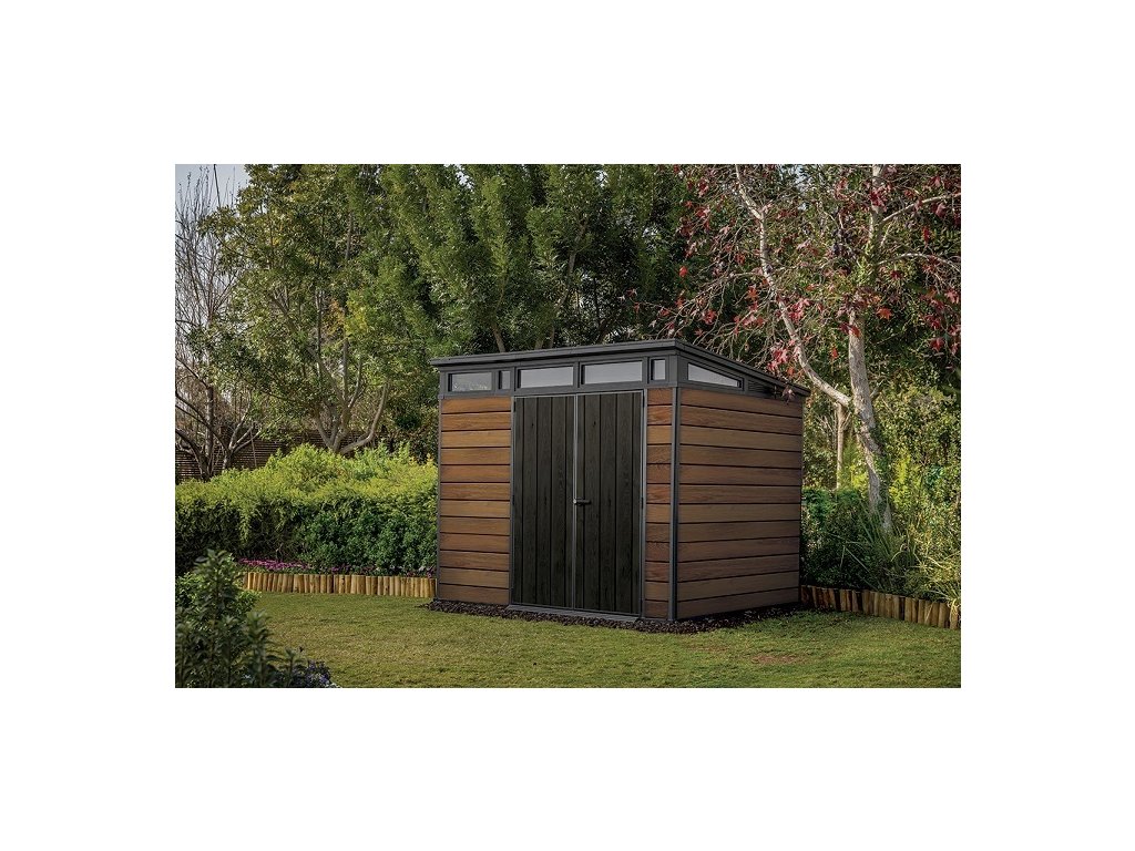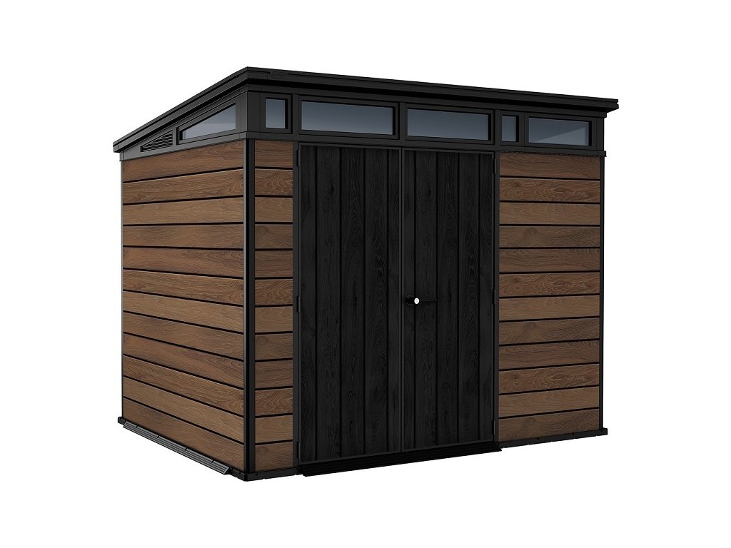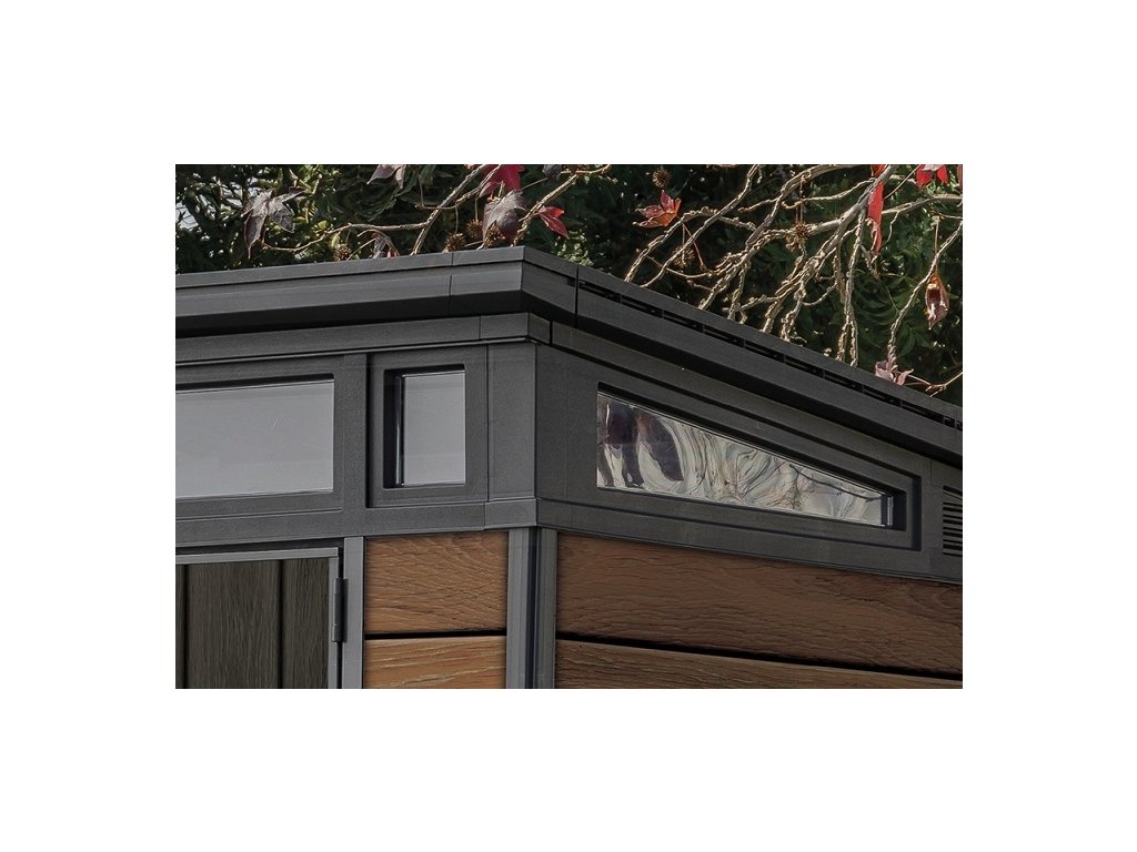 Bezúdržbový domek PENT 9x7 je vyroben z jedinečného materiálu DECOCOAT, který je inspirován moderním vzhledem v imitaci dřeva. Domek má robustní konstrukci s dvojitými stěnami a kovové výztuhy.