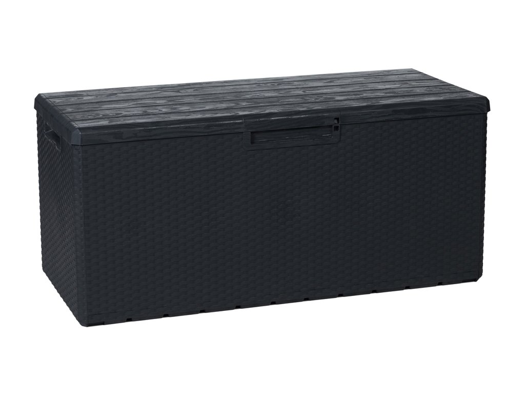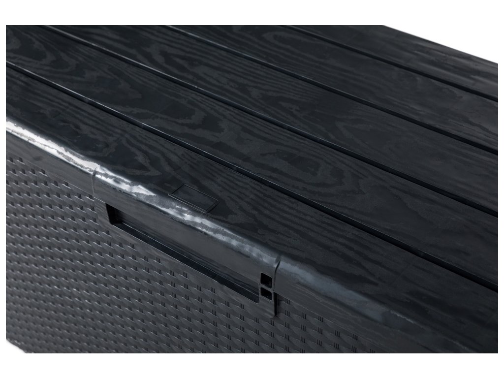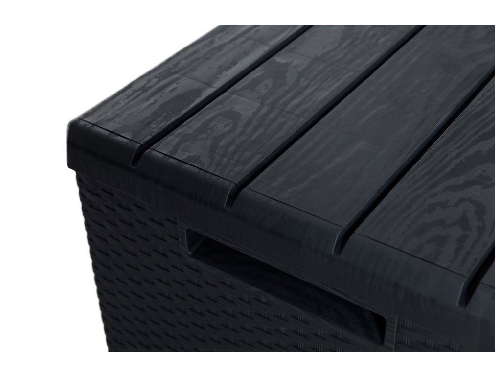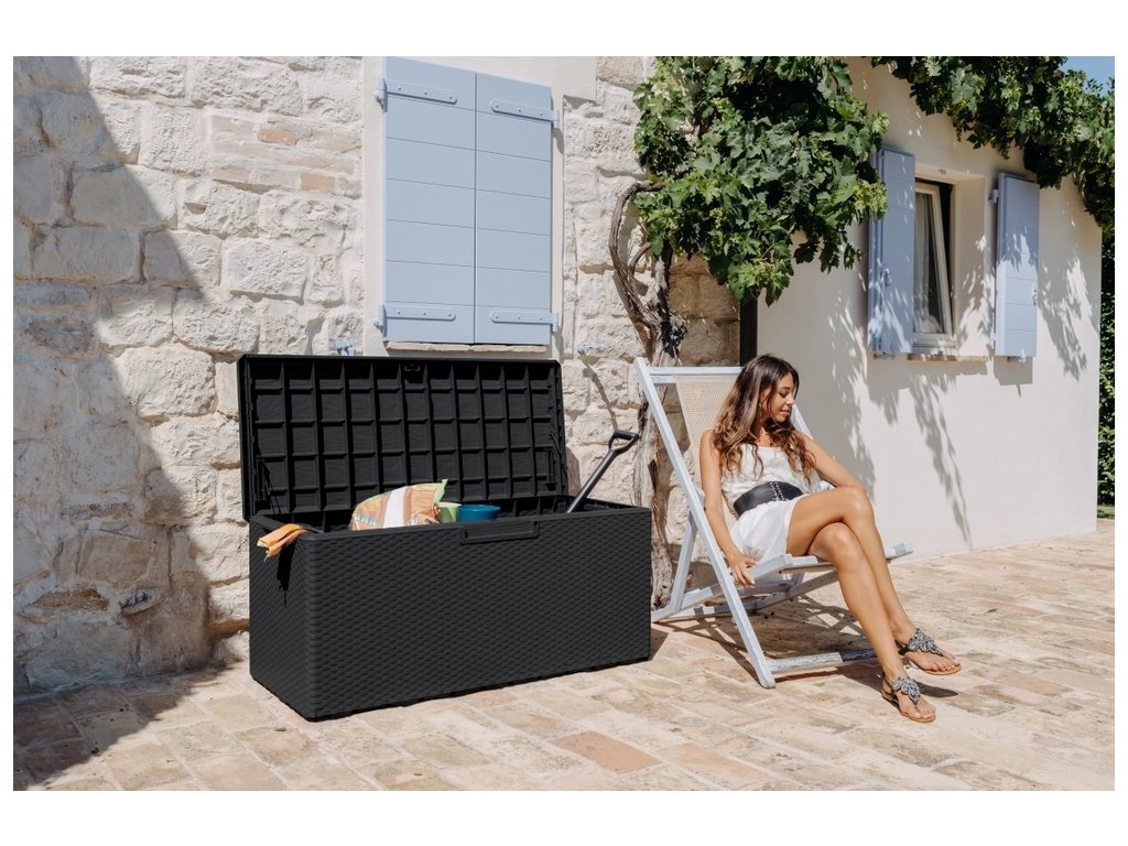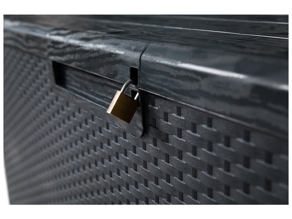Imitace ratanového povrchu na bočních stěnách a dřevěného na víku dodává PORTOFINO 340 l luxusní vzhled, který se bude skvěle hodit k jakémukoli zahradnímu designu. Jeho grafitová barva je vkusná a neutrální, takže se dokonale sladí s okolím. Tento box má také možnost uzamčení, což zajišťuje bezpečné uložení Vašich cenností a nábytku.