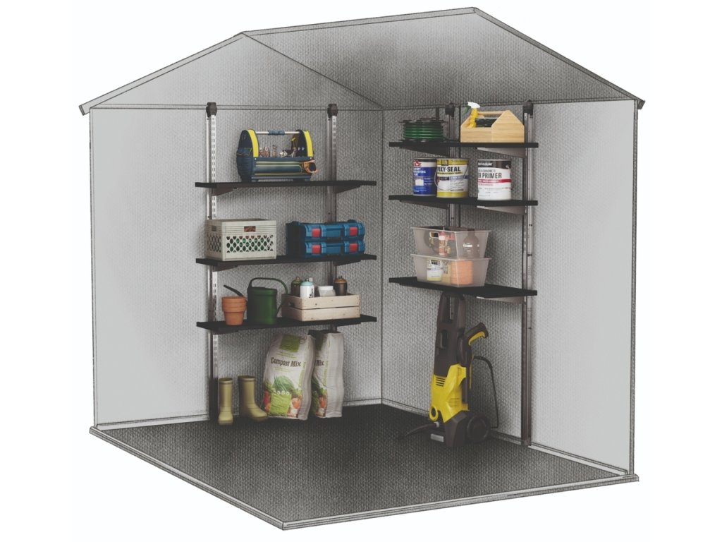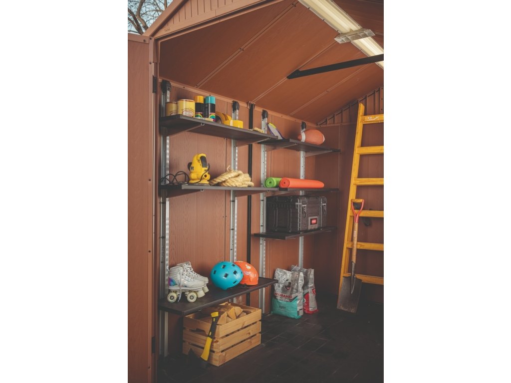 3 police zpevněné ocelí uchytíte na kolejnice. Výšku každé z nich si přizpůsobíte tak, abyste na ně bez problému dosáhli. Jedna police unese až 30 kg zátěže. Regál vám umožní zorganizovat zahradní náčiní, nářadí, štětce, plechovky, polštáře, hračky nebo cokoliv jiného, co v domku Keter skladujete.