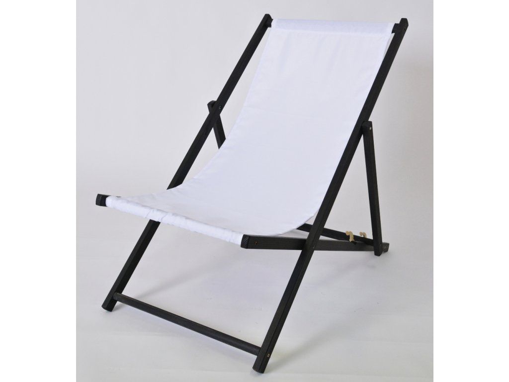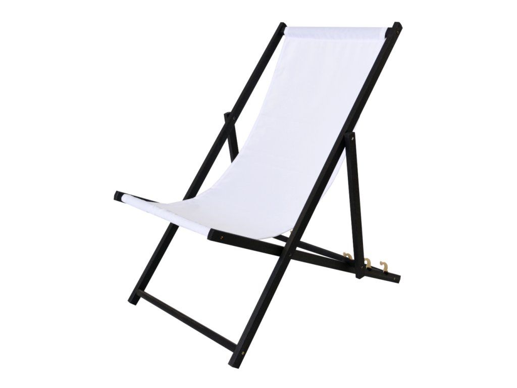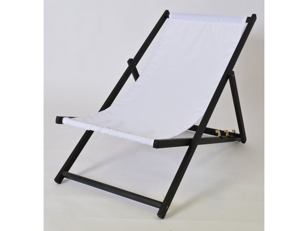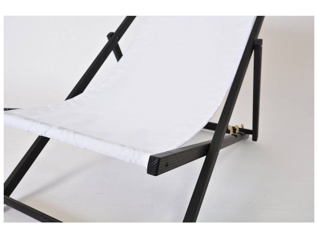 Klasické, rozkládací, dřevěné lehátko BAHAMA. Jeho jedinečný design spočívá v elegantním spojení černě mořené konstrukce s jemnou bílou látkou sedáku, díky čemuž se odlišuje od ostatních.