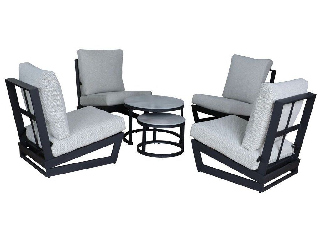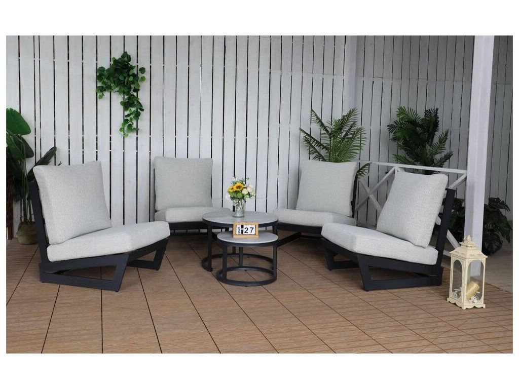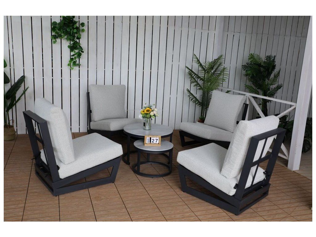 Luxusní hliníkový coffee set v grafitovém provedení, doplněna o stolovou desku z hliníku a pryskyřice. Moderní souprava, která skvěle zapadne do každého exteriéru či interiéru.