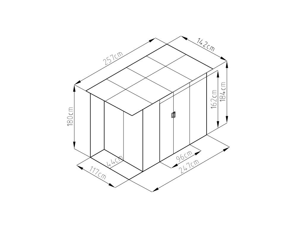 Domek má dvojité posuvné dveře, tudíž do něj budete mít pohodlný přístup. Rozměr dveří: 96x160 cm.