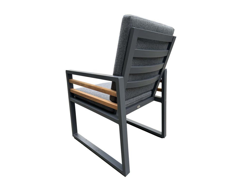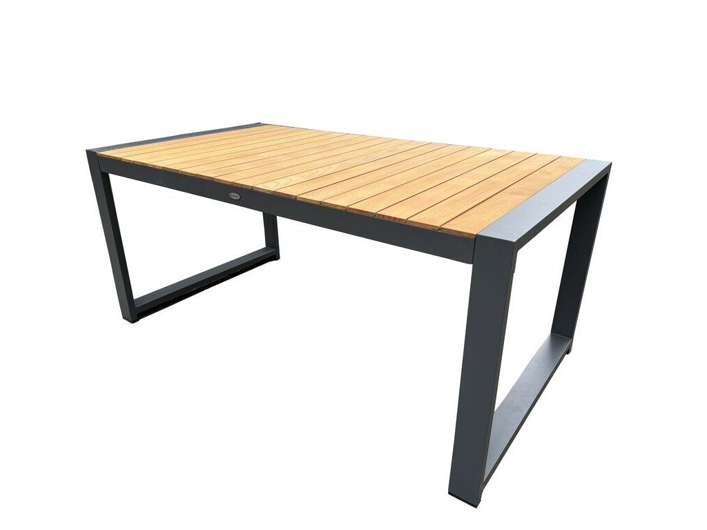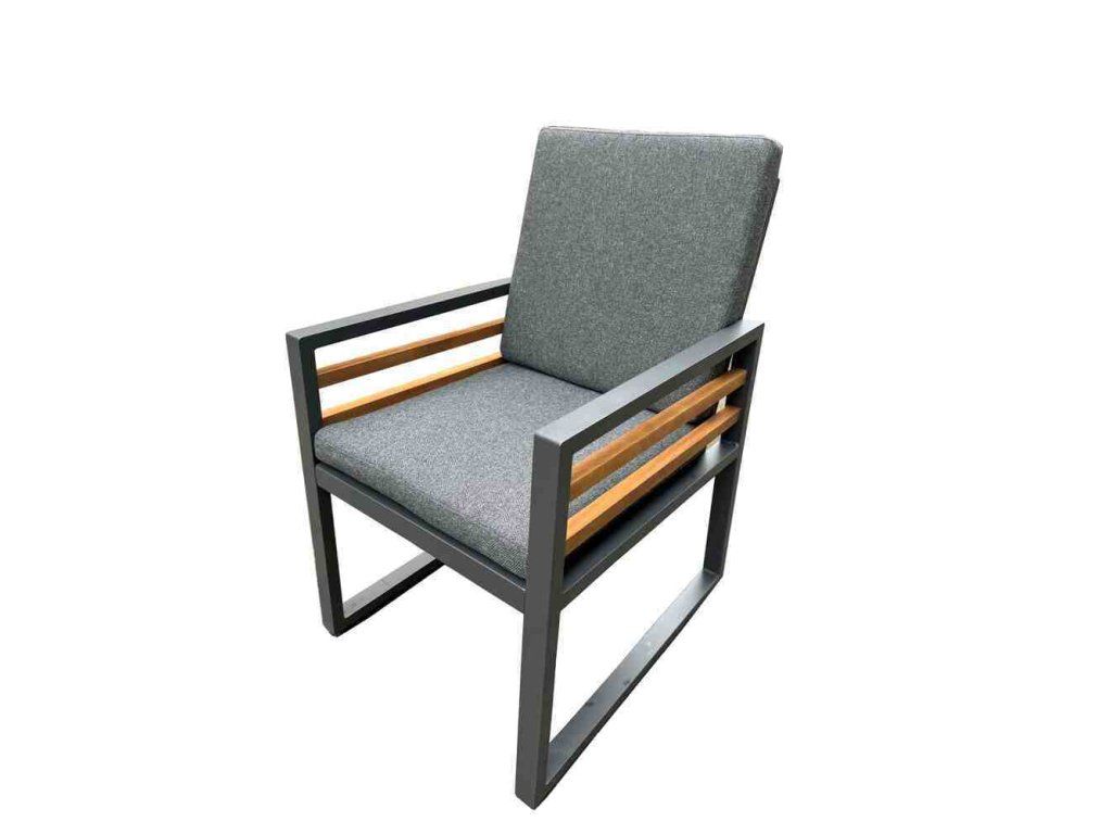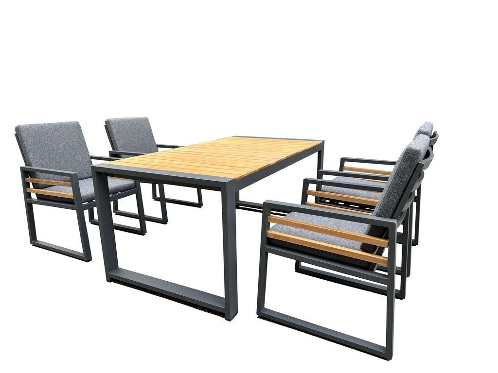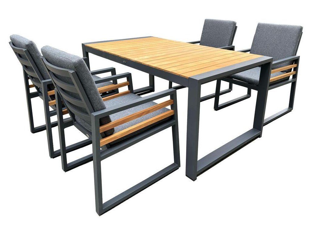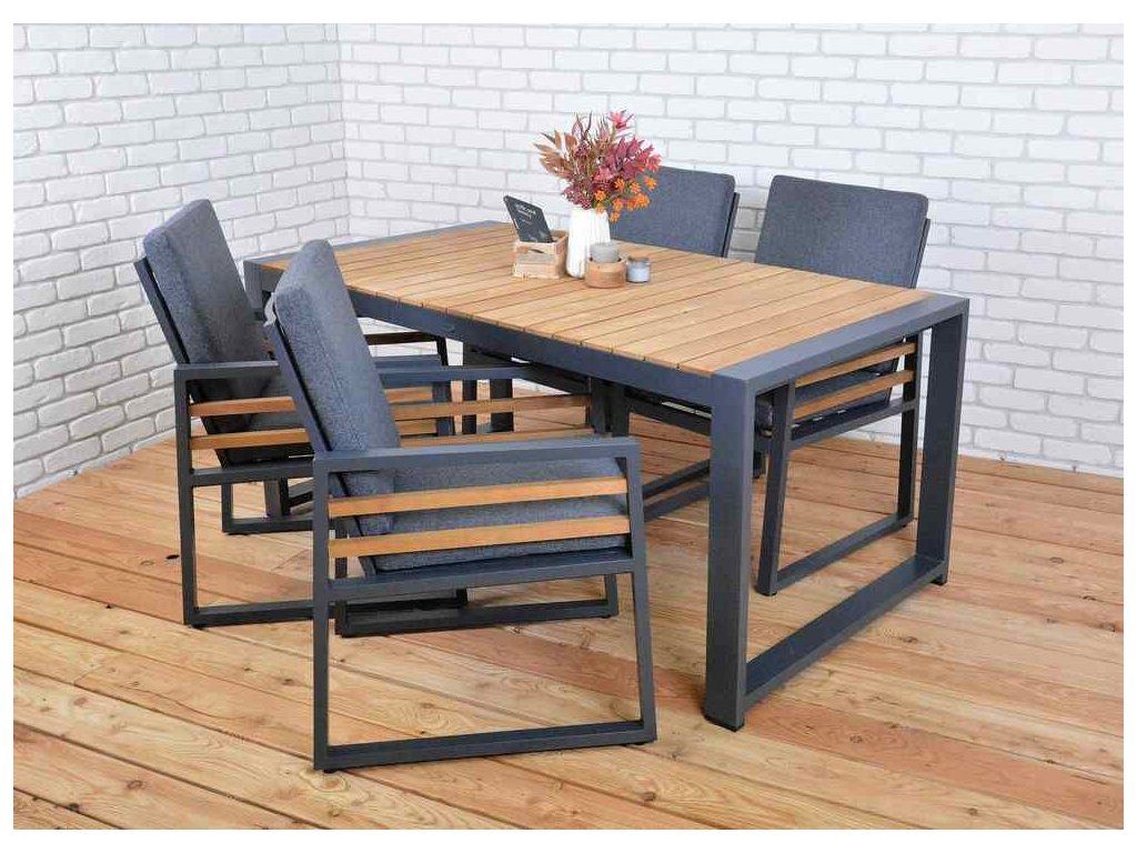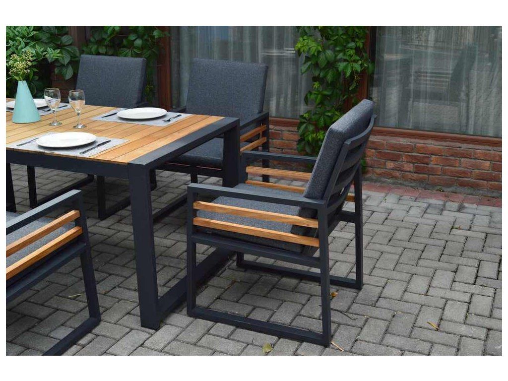 Luxusní hliníková souprava v grafitovém provedení, doplněna o dřevěné výplně z novozélandské borovice ošetřené pryskyřicí a voskovým olejem a stolovou desku z teaku. Moderní souprava, která skvěle zapadne do každého exteriéru či interiéru.