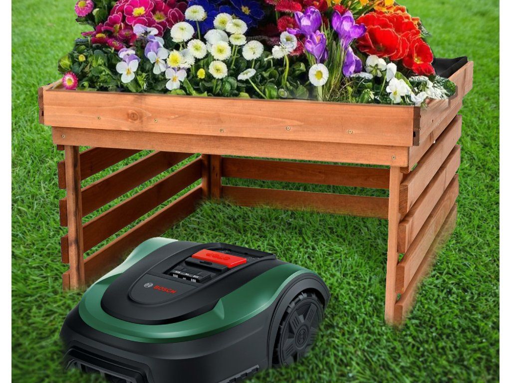 Garáž pro robotickou sekačku. Efektivní úschova. Na střeše je prostor pro pěstování rostlin. Elegantní řešení pro nenápadné uschování robotické sekačky.