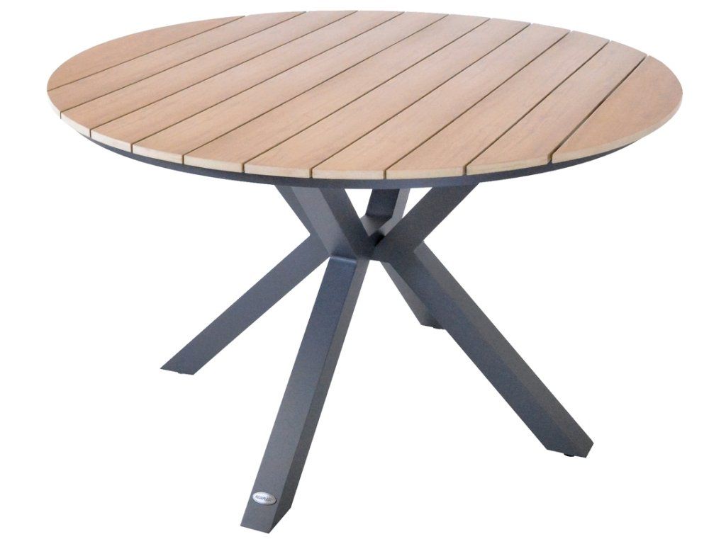 Luxusní hliníkový stůl v grafitovém provedení, doplněný o stolovou desku z polywoodu v imitaci dřeva.