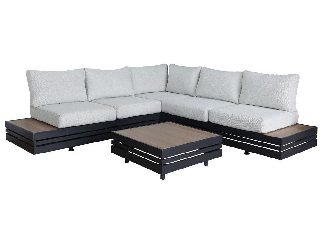 Luxusní hliníková souprava v grafitovém provedení, doplněna o stolovou desku z hliníku a pryskyřice v dezénu dřeva. Moderní souprava, která skvěle zapadne do každého exteriéru či interiéru.