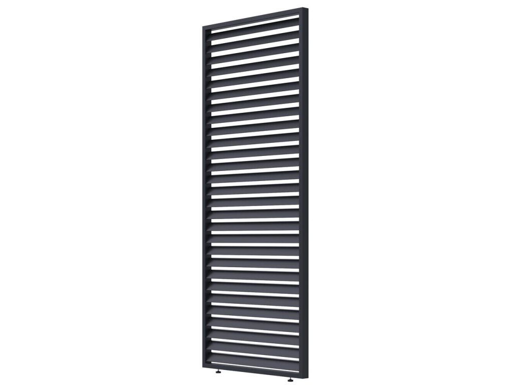 Velmi pevná a stabilní konstrukce v antracitové barvě RAL 7016, v matné povrchové úpravě. Panel a lamely jsou vyrobeny z vysoce kvalitního hliníku, který je ošetřen práškovou barvou, což zaručuje odolnost vůči povětrnostním vlivům.