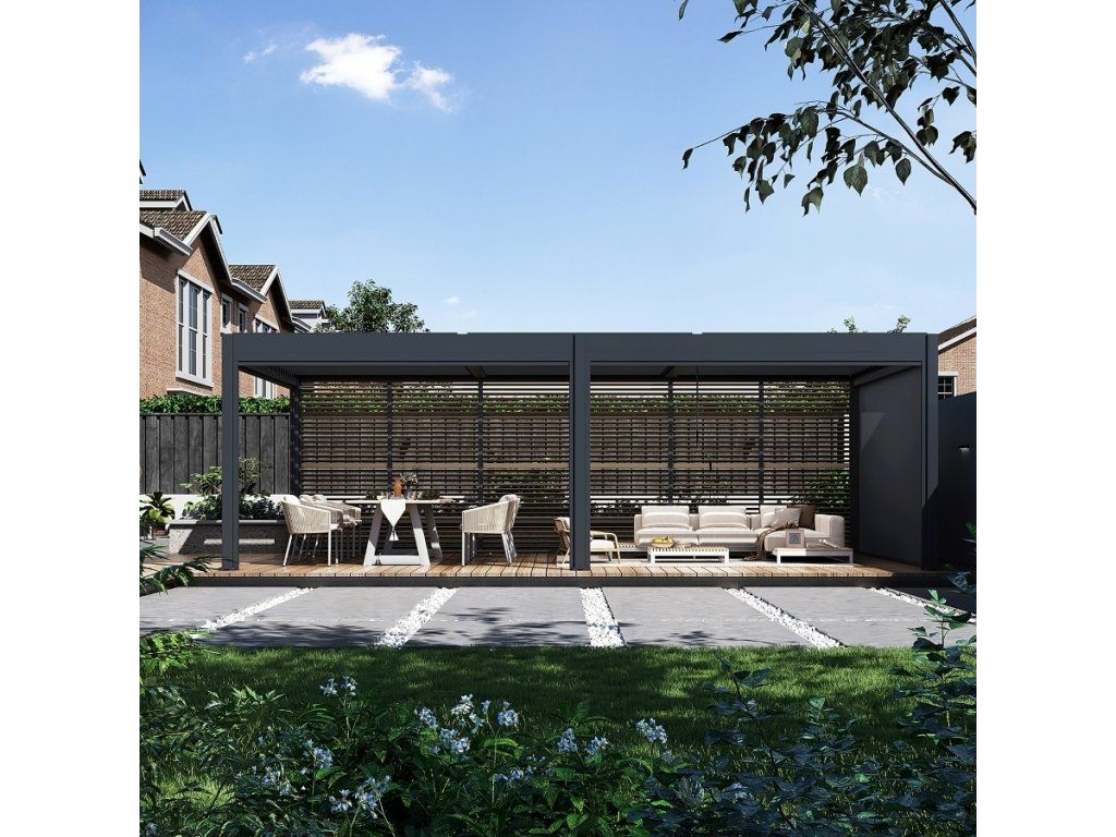 Pro maximální využití bioklimatických pergol nabízíme také příslušenství v podobě panelu s horizontálními sklápěcími lamelami pro zastínění bioklimatické pergoly a získání většího soukromí.