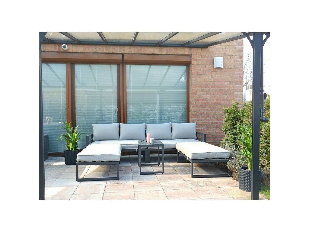 Luxusní souprava s hliníkovou konstrukcí, která je pokryta šedou práškovou barvou. Moderní design.