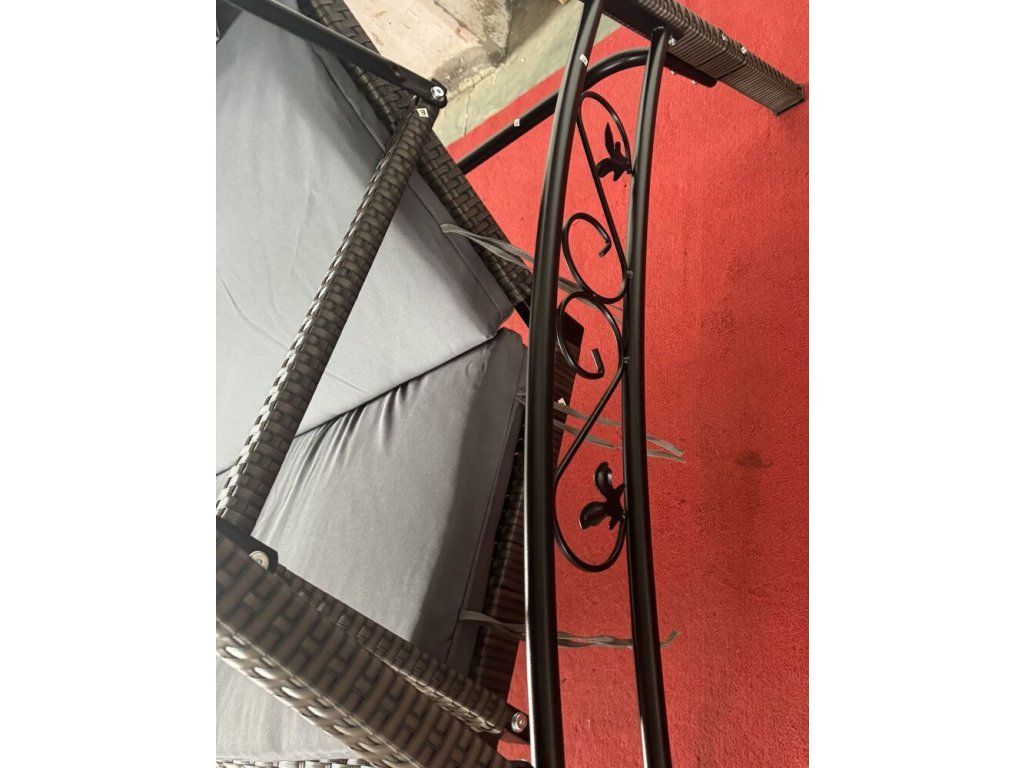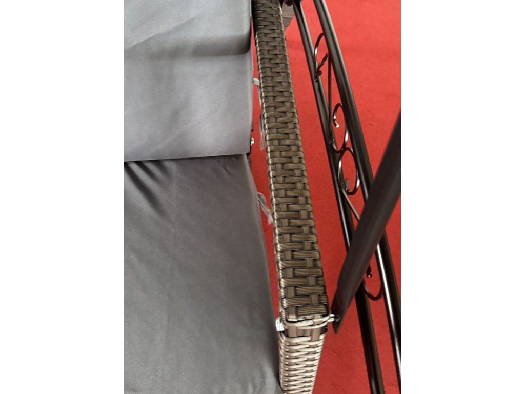 Zahradní houpačka s kovovou konstrukcí a umělým ratanem.