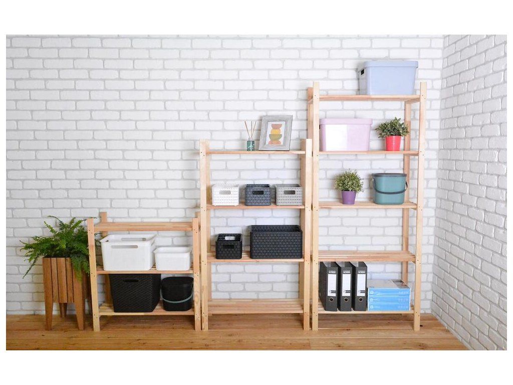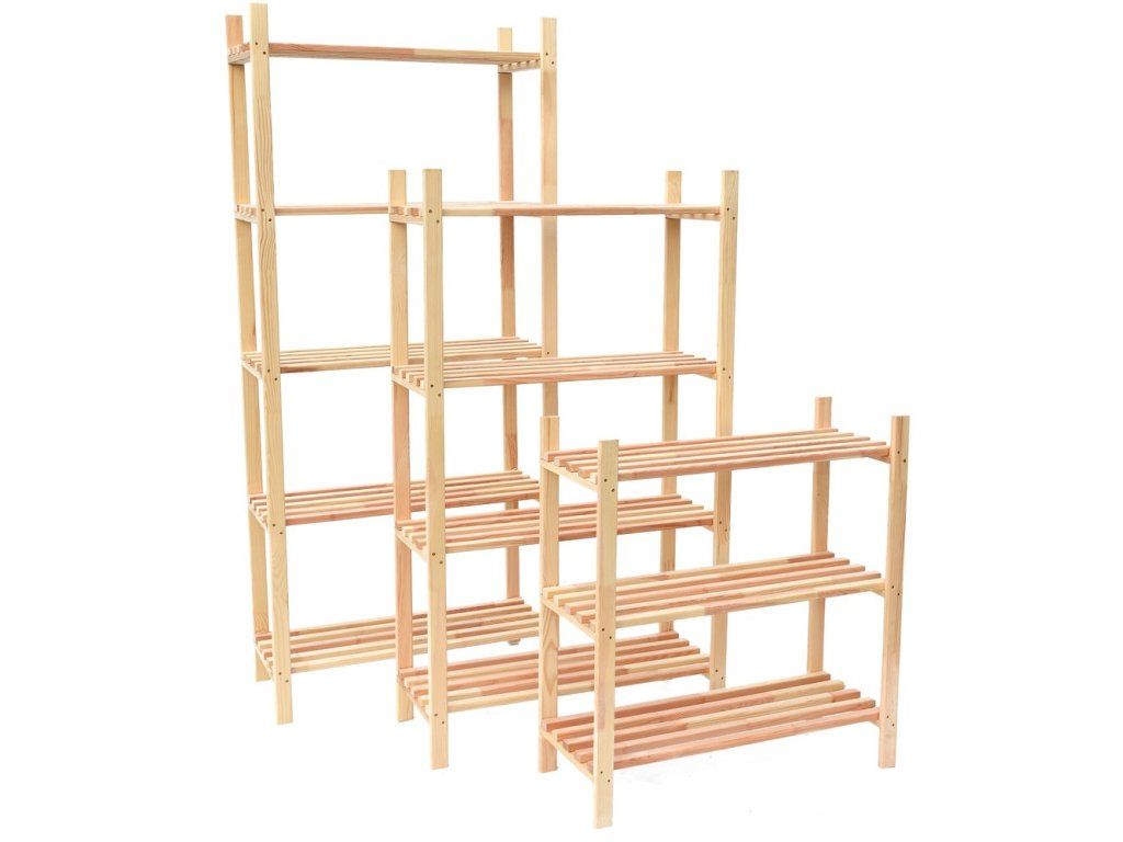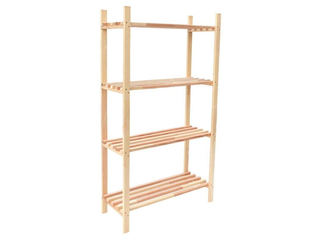 Každá ze 4 polic unese až 30 kg. Přírodní provedení umožňuje regál natřít či ošetřit dle potřeby. Ideální pro skladování věcí ve spíži či dílně.