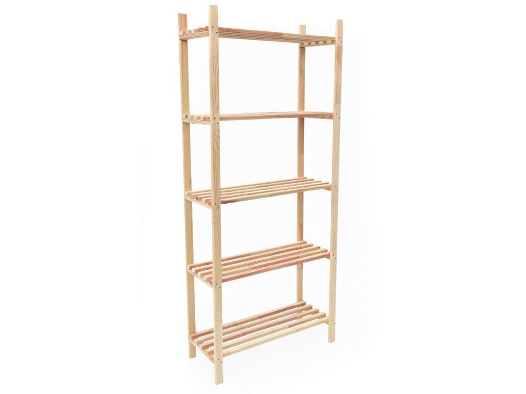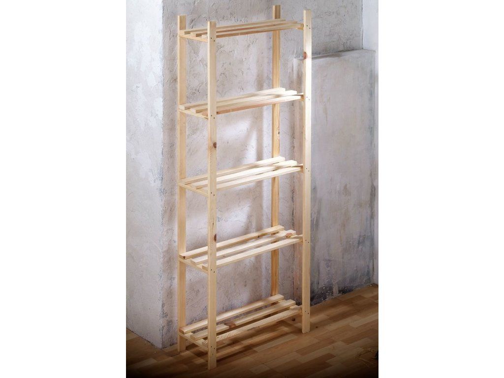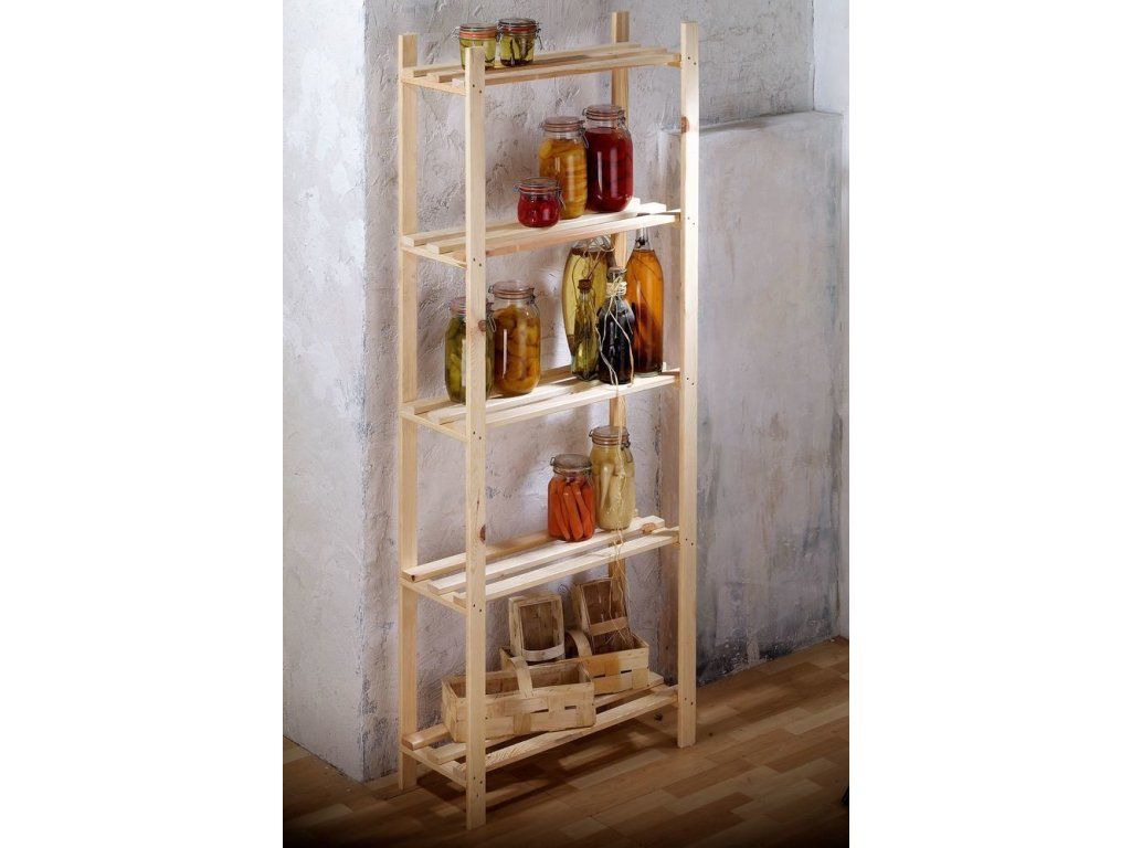 Každá z 5 polic unese až 30 kg. Přírodní provedení umožňuje regál natřít či ošetřit dle potřeby. Ideální pro skladování věcí ve spíži či dílně.