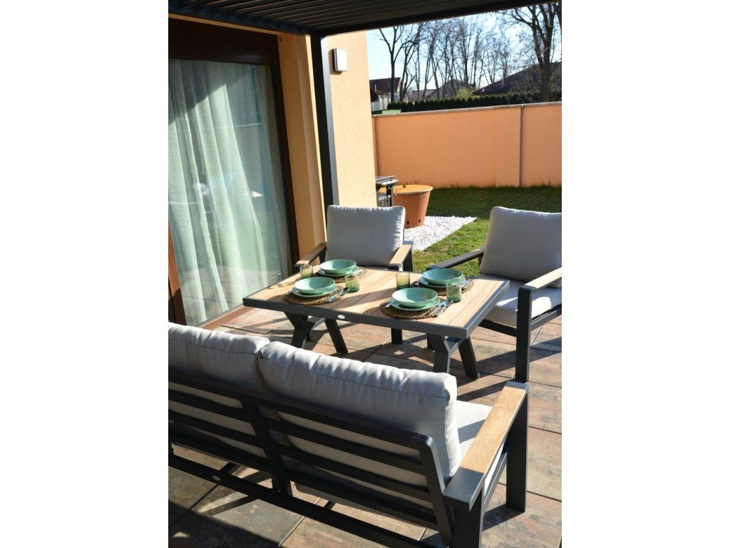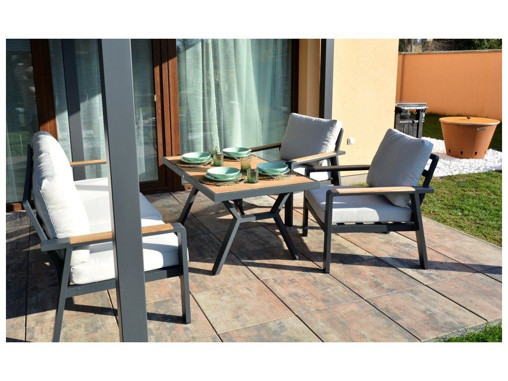 Luxusní hliníková souprava v grafitovém provedení, doplněna o teakové područky a desku stolu. Moderní souprava, která skvěle zapadne do každého exteriéru či interiéru.